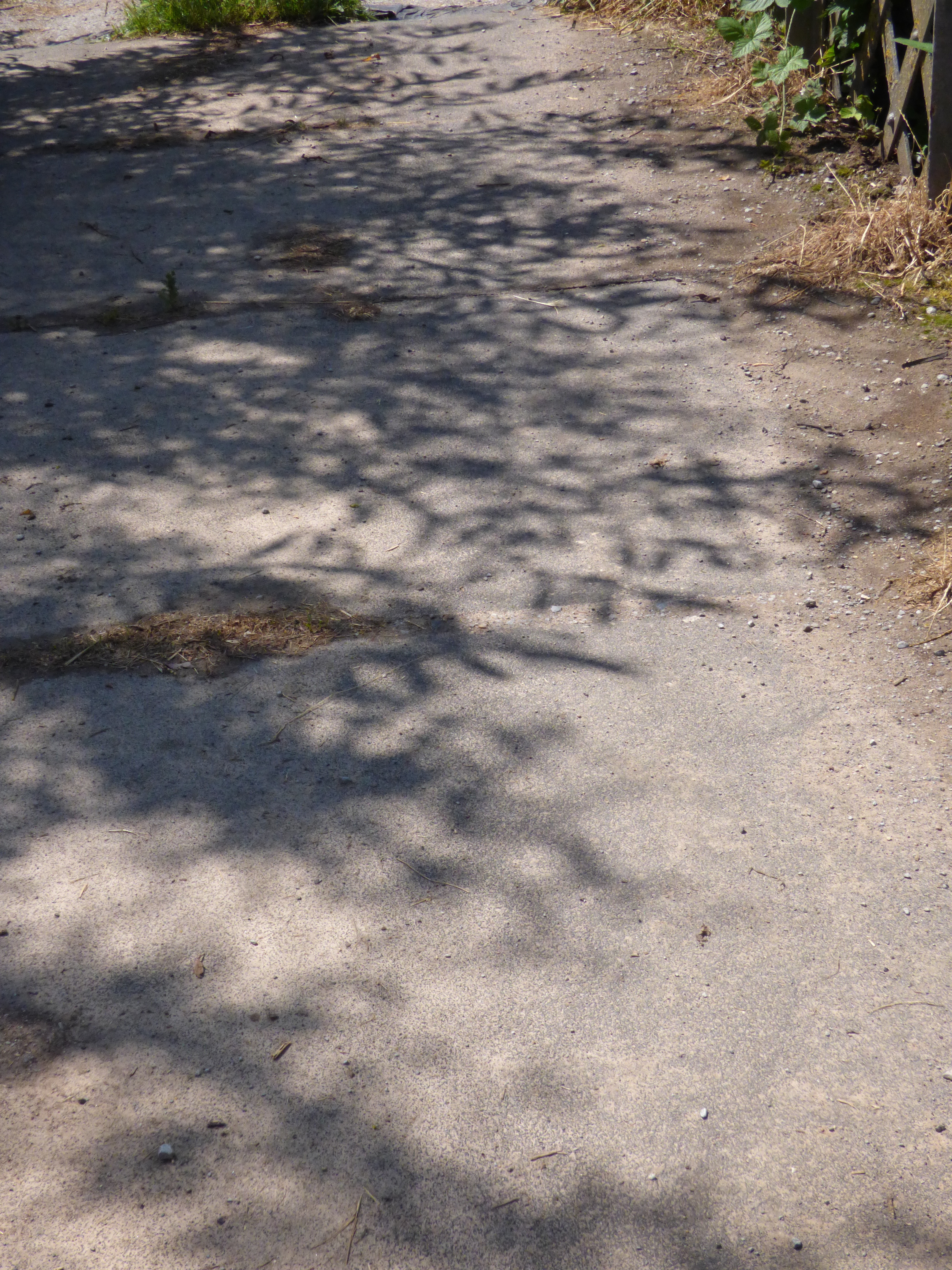 Positive and negative patterns from the shadows of willow leaves on a pathway and sunlight through cut paper.
