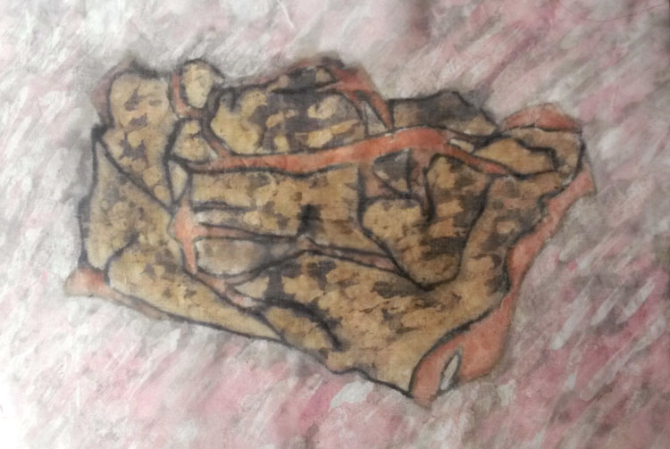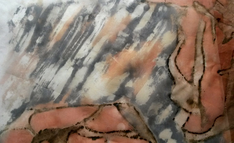 Despite working with natural dyes for many years, I have not tried using them in combination with wax before.This is partly due to the fact that for most natural colours you need heat and if applied cold, the dyes need to be left for a considerable period to bite. However, these experiments have proved subtle but interesting: using madder cutch and iron.