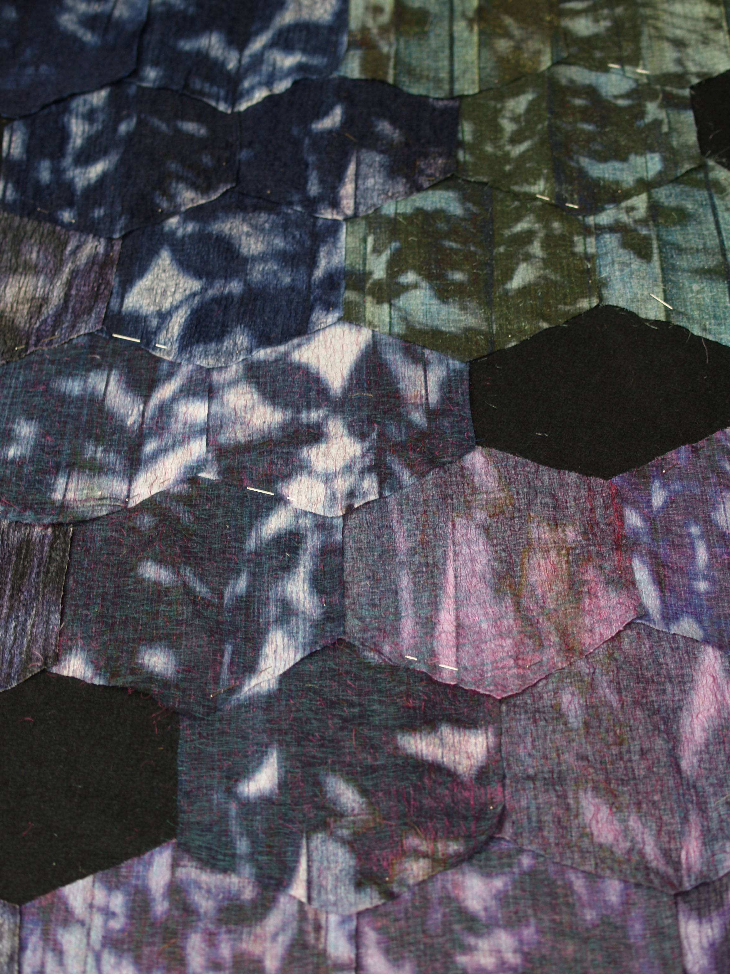 I tried digitally printing hexagons on the fabric but these distorted when needle punched.