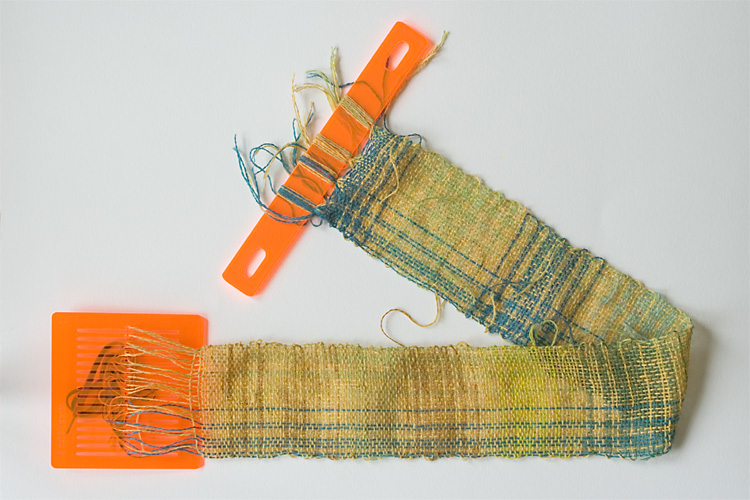 ‘Ombré’ in weaving is used to describe the gradual introduction of one colour into another through stripe. There are so many possibilities – changing colours and proportions, using high and low contrasting colours, moving through colour families, putting complementary colours together, using neutrals… I love experimenting by wrapping yarn around cardboard – a quick and easy way to see what combinations do and do not work.