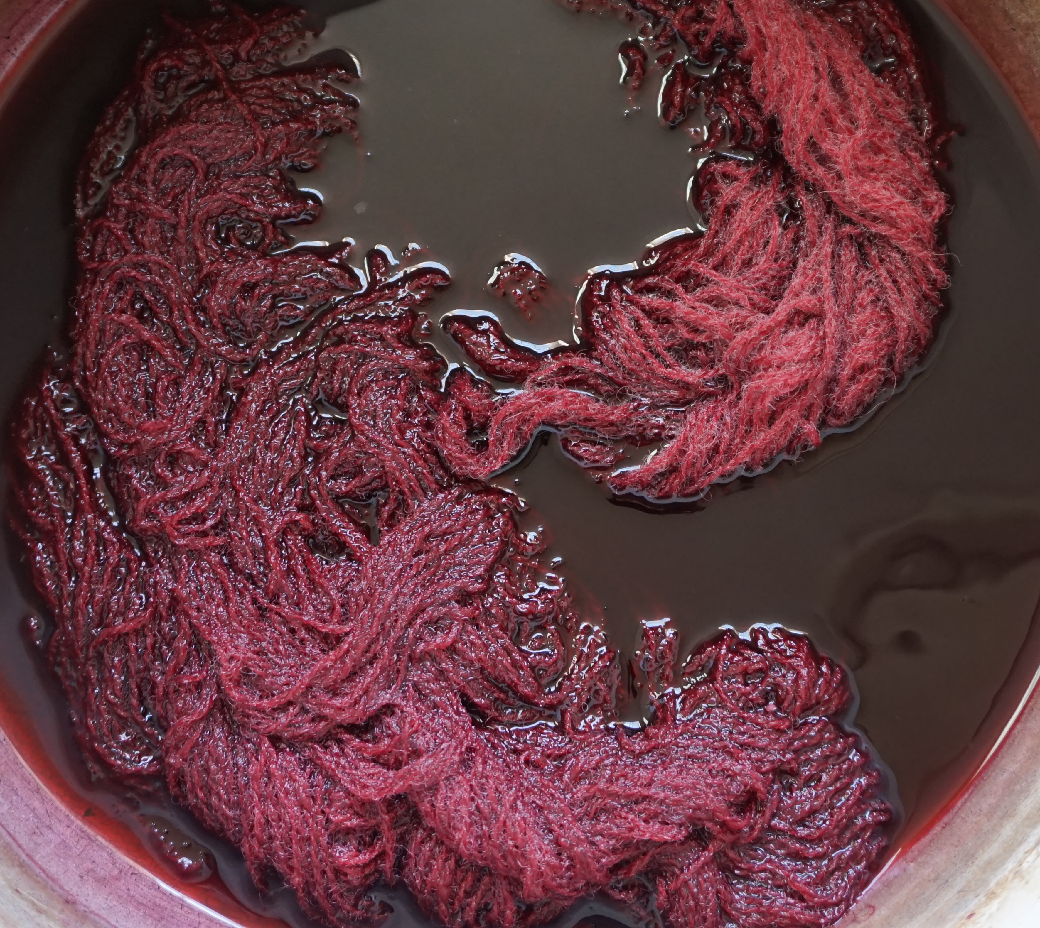 I used alum and cream of tartar together as mordants; a combination known to ancient dyers. Alum is found in silicates and the quantities used for mordanting are carefully measured to ensure that there is complete take up into the fiber (Sandberg, 1994). Cream of tartar was known as ‘wine stone’ by ancient dyers and allows more take-up of the dye.