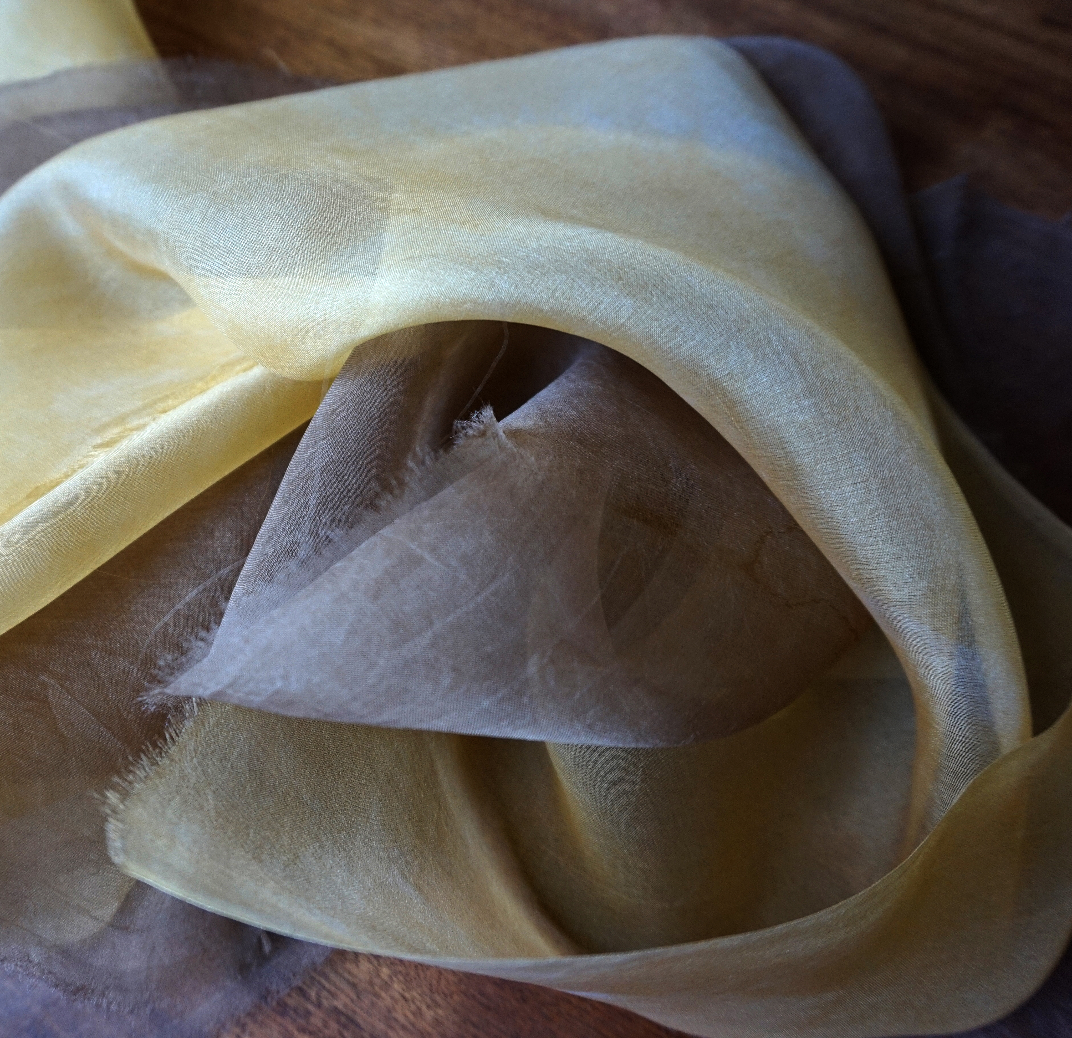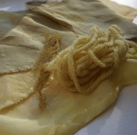 I began by identifying the ones that I had in and around the garden. To my surprise, I found that the strongest colours came from plants right outside my front door, such as marjoram tops that yield a beautiful golden yellow to olive green, illustrated below on both wool and silk.