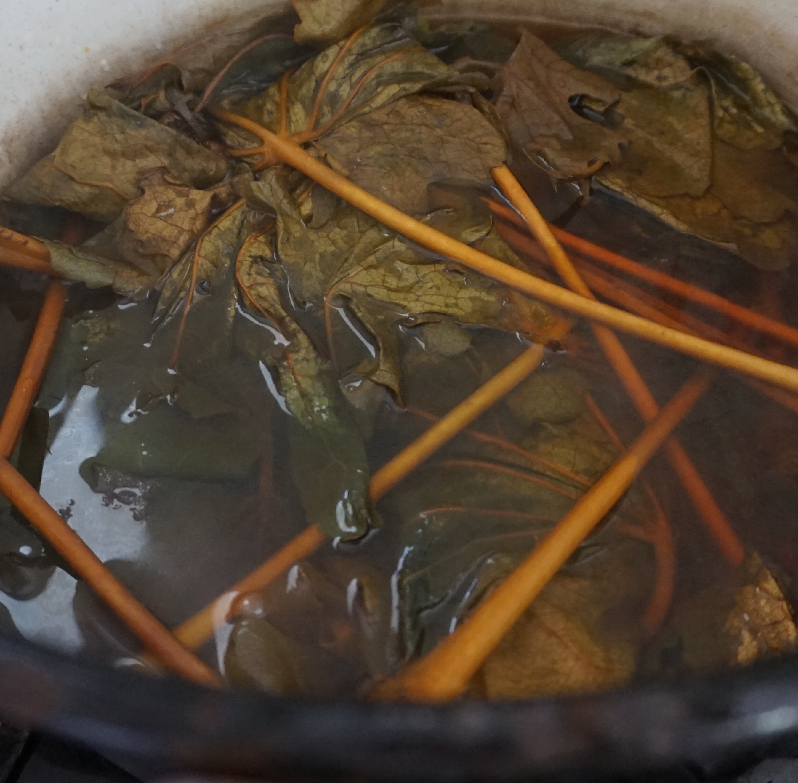 Many of the wild plants used in the past contain tannin, which is a natural defence against disease and is employed as a mordant. Sumac, oak and walnut were widely used but many other plants contain tannin in leaves and bark. Tannin also imparts a colour and darkens the dye bath. I am now experimenting with blackberry leaves and stalks as an example.