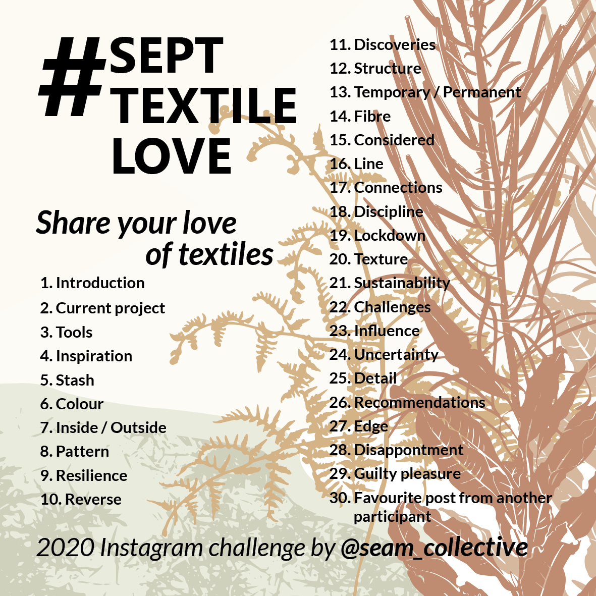 #SeptTextileLove is open to everyone who loves textiles, and has an Instagram account, from all around the world; from those who have just started making, to makers for family and friends, to enthusiasts, to professionals. We are looking forward to seeing gorgeous photos of your work, getting to know you and your textiles, and having some interesting conversations about textiles and perhaps how the way you work has changed this year.