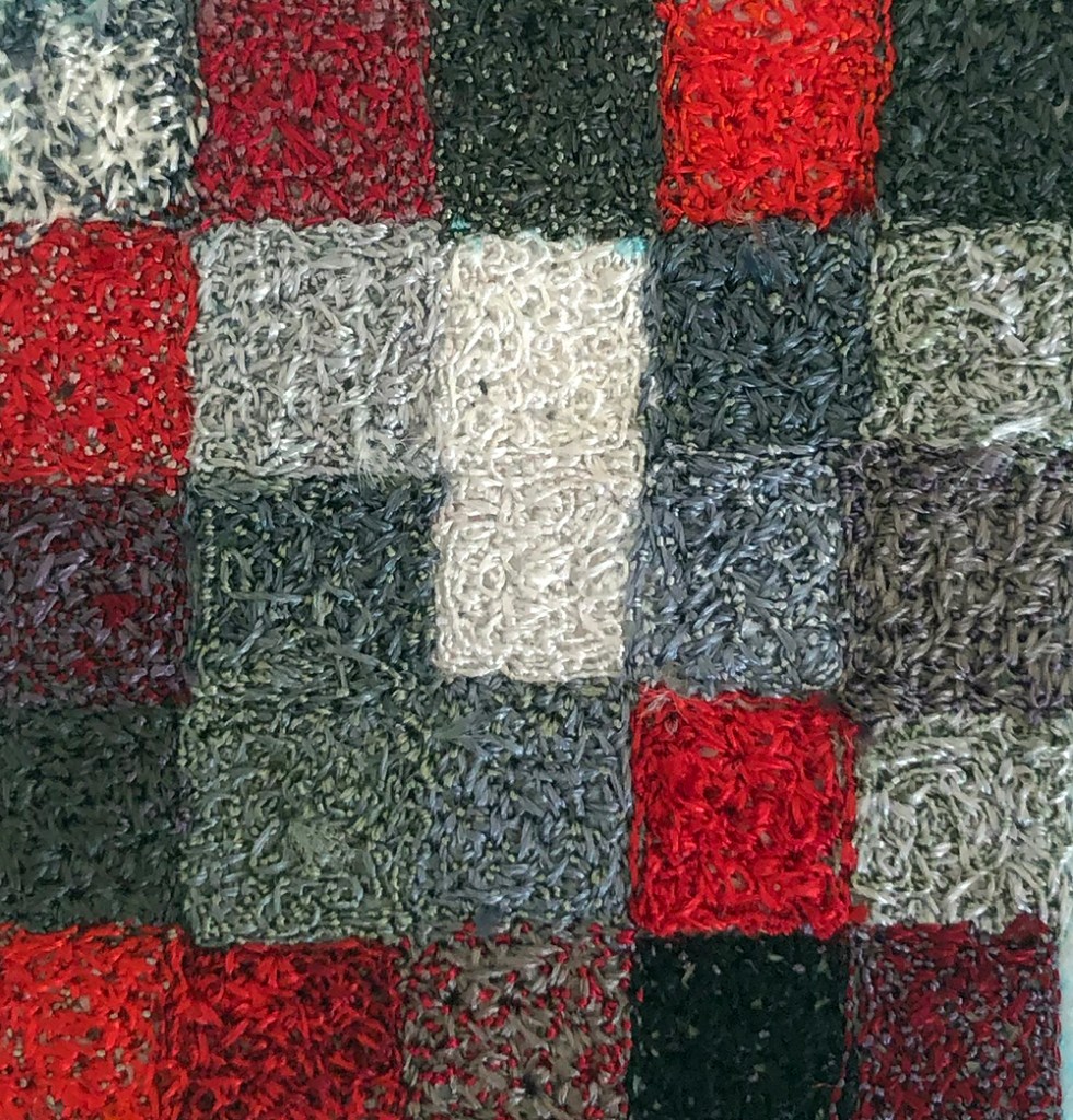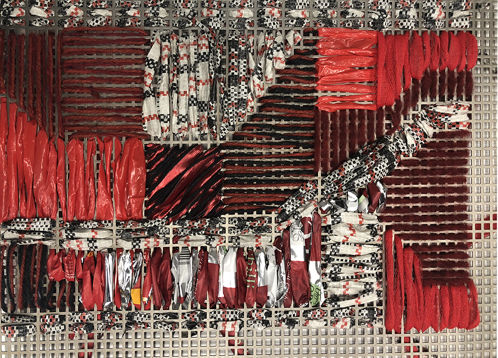The last experiment involved a trip to the metal work department where I found a piece of discarded perforated sheet metal. I used what was left of my found materials and made a sampler containing crisp packets, laundry bags, plastic carrier bags, garden twine and left over ribbon.