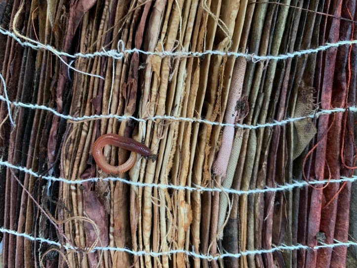 These experiments become pages for a Coptic bound book, 99% ‘waste’ and 1% vintage linen thread, and hours and days of stitching labour. The book I created is given to the worms, part of the composting cycle.