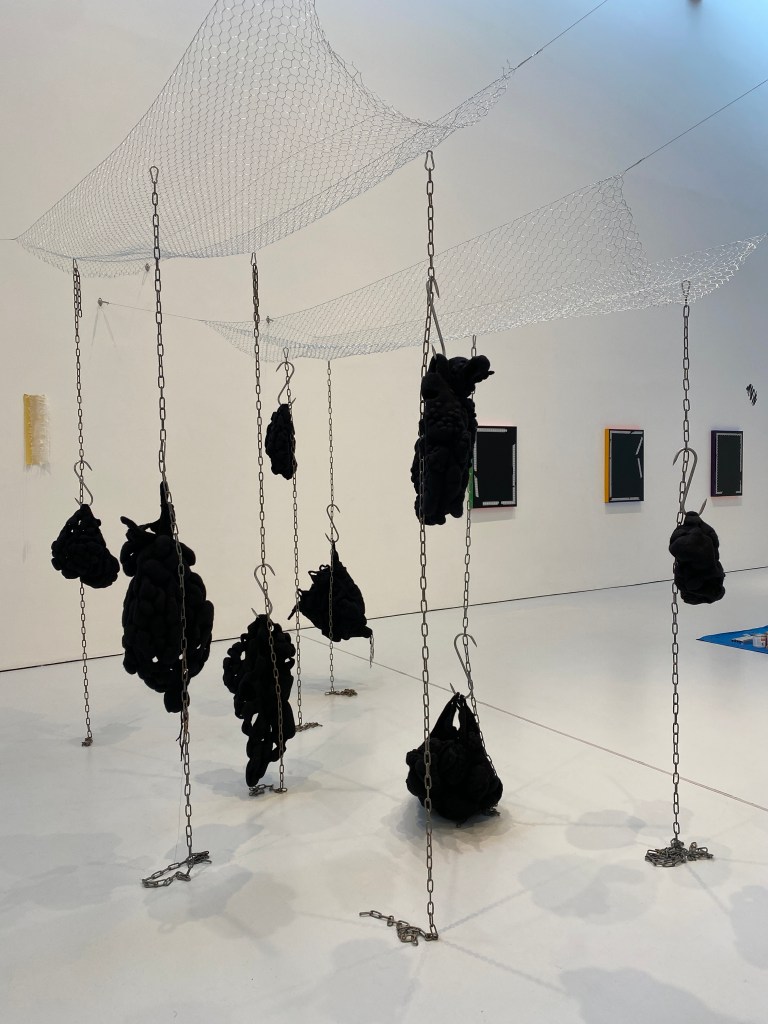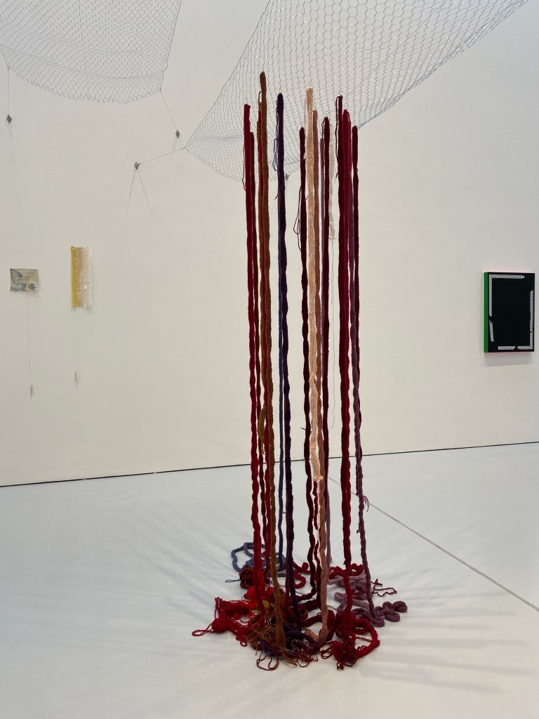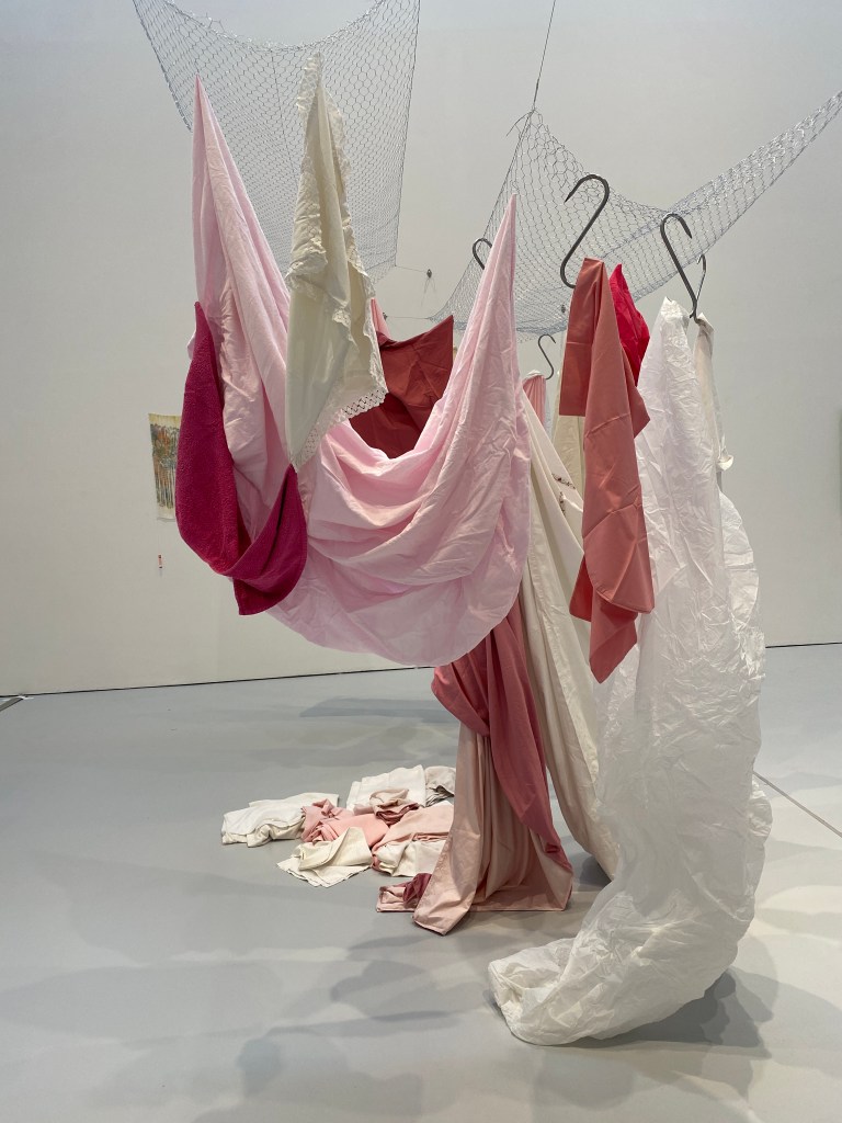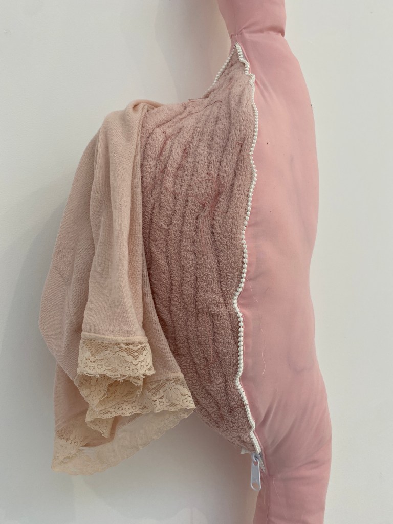 I’ve been especially aware of this as I’ve been developing new work during the residency. There is a poignancy in creating a hanging installation with objects as intimate as my parents’ used bedding and towels. I’ve also been sculpting an abstract self-portrait with these materials, and as I manipulate and transform the cloth through stitch, the movement of my hands and body activates my mind through memory, smell, touch, grief. I’m sculpting me, but thinking of them, especially, actually, my mother, my (m)other. And I am thinking through my making.