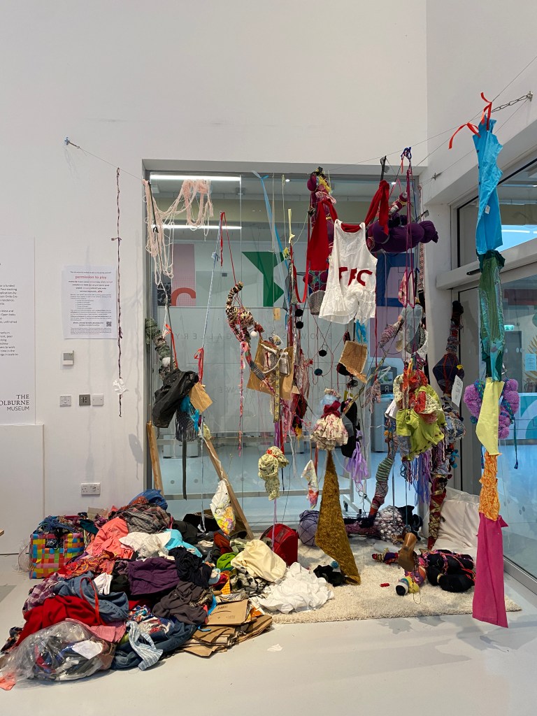 At any point a visitor can arrive in the gallery, and then I move into a different head space, from the dark side to the brighter side – smiling, greeting, listening, talking, inviting, and eventually, maybe, making alongside them, working now with anonymous used clothing from a local charity shop, using my body to rip, wrap, tie, stitch, play; making a sculpture to add to the growing, participatory assemblage. I’m making connections and building community.