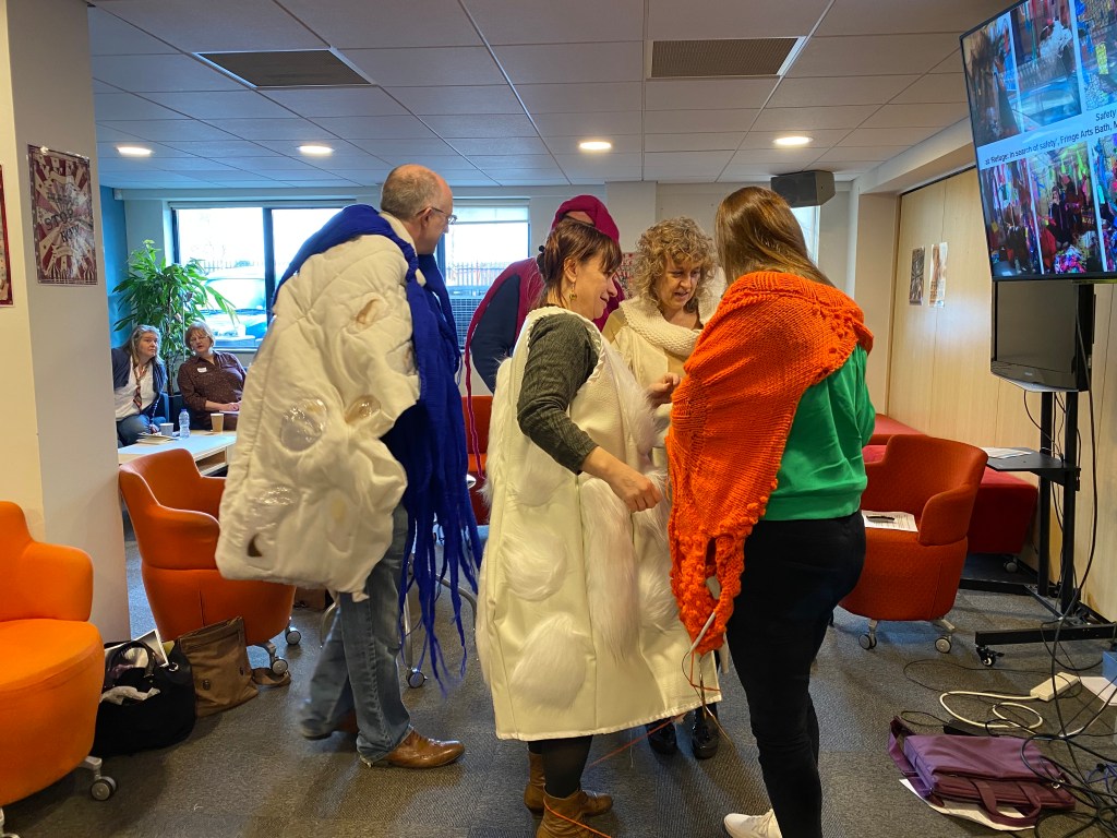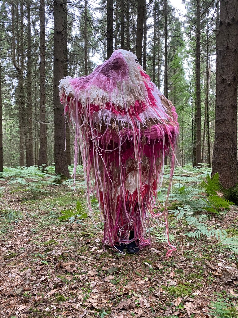 At the moment, I’m spending as much time as I can at seam’s research residency, A Visible THREAD. Being able to share the space and time that this opportunity offers with the other seam members, and with our visitors, has been a delight. Working alongside one another allows for meandering and in-depth conversation and comfortable, concentrating silences. I’ve spent much of my time installing, deinstalling and reinstalling my soft sculptures, suspending them in different ways from a curious contraption made of chicken wire and steel wire rope. It’s been fabulous to have so much space to experiment with different ways to hang my work, at times also wearing my soft sculptures and documenting other people as they interact with them. I’ve also been engaging visitors, inviting them to make something to add to the growing queer/subversive sculptural installation, ‘permission to play’, a participatory project that I’m facilitating with Oly Bliss. And then there’s the tidying, tending and sweeping…