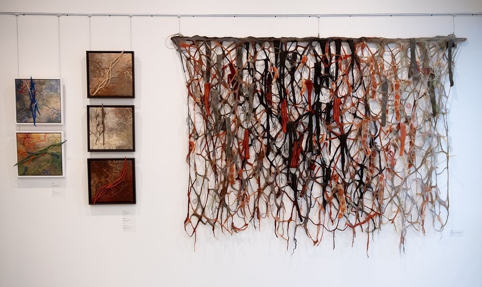Turn a corner in the gallery and the journey continues to Oxfordshire, England. The artworks here are a reflection of lockdown walks and a time to source foraged local vegetation for natural dye.