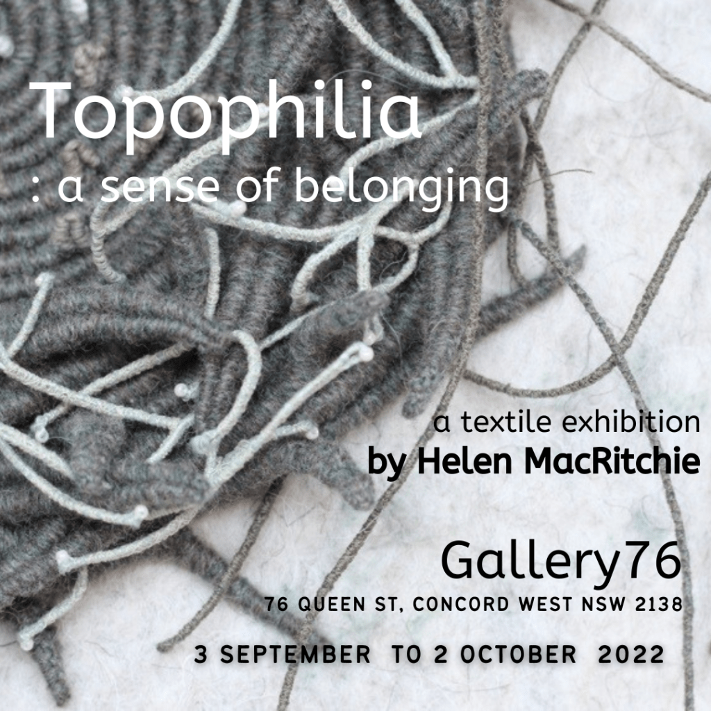 At Gallery76 in Sydney, Australia, I am currently presenting my first solo exhibition – Topophilia: a sense of belonging. The works on display consist of colourful felt-based hangings, framed artworks and sculptures inspired by my experiences living in Scotland, Australia and recently back in England.