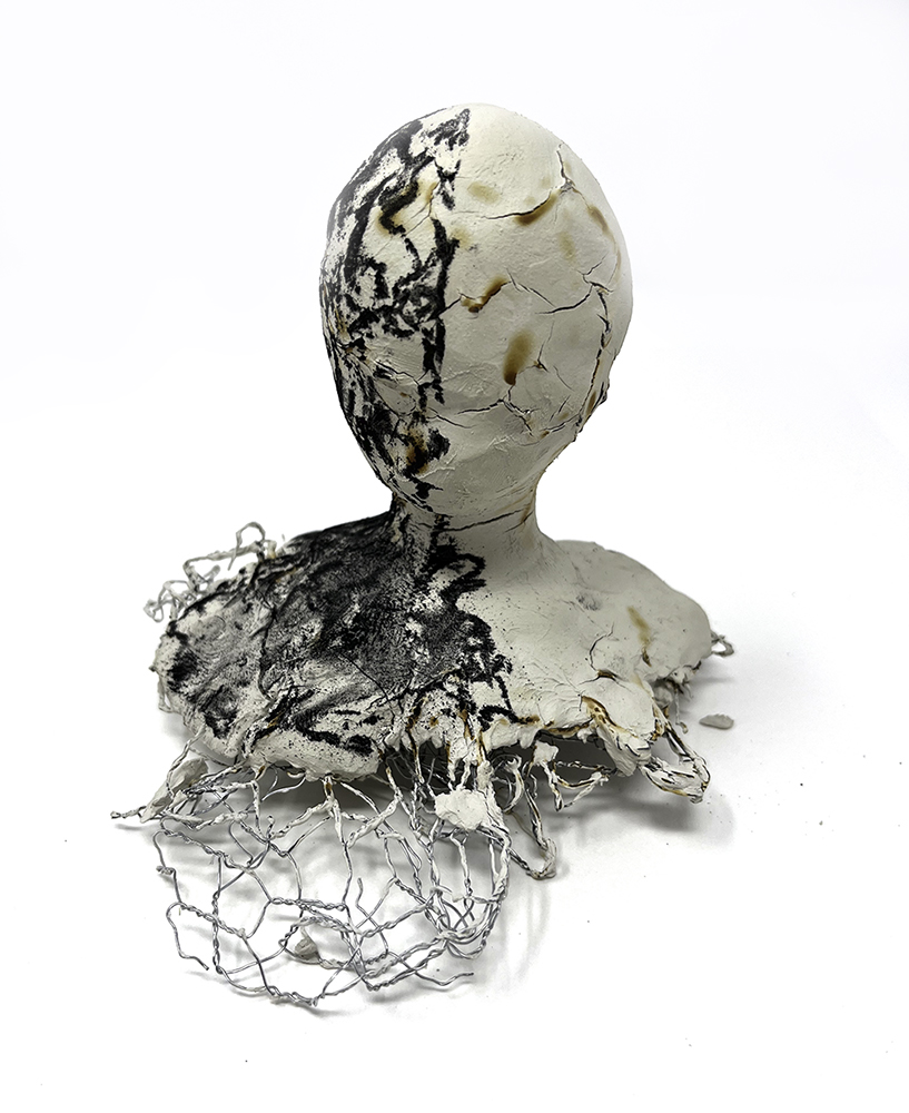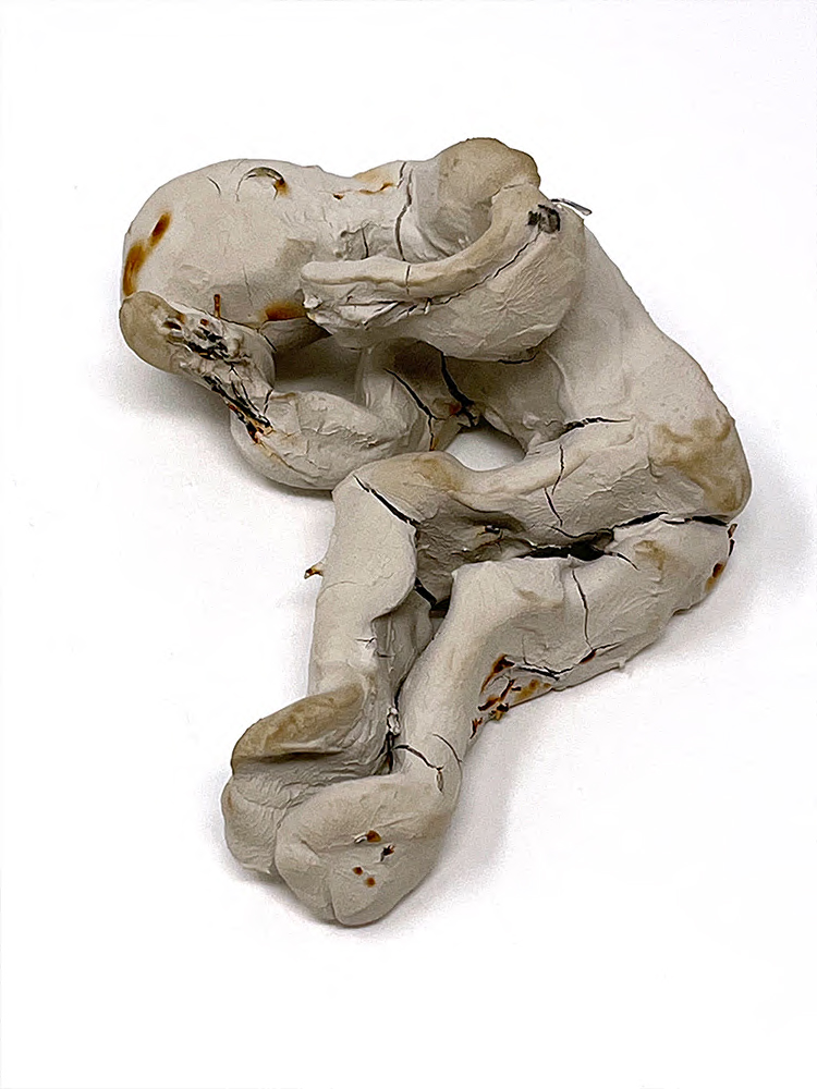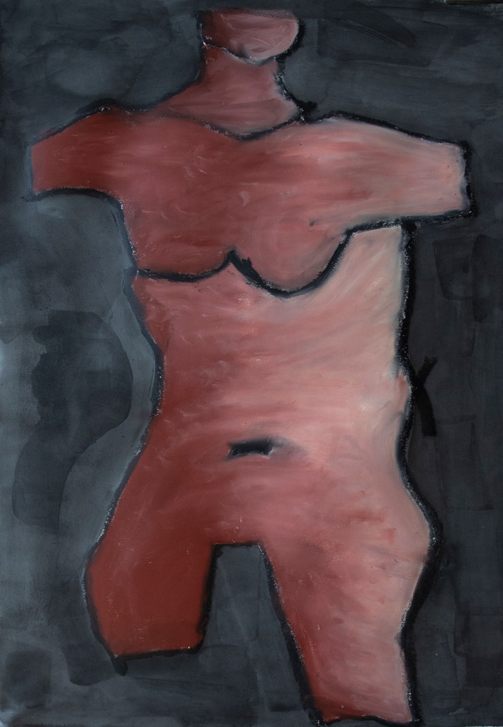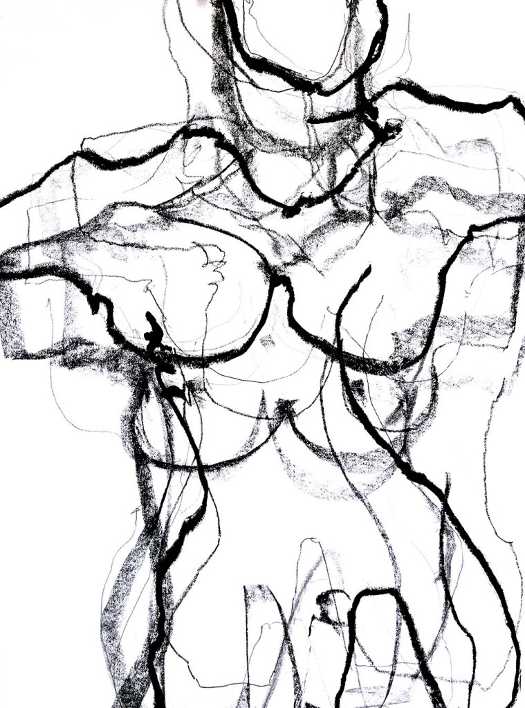 I returned to blind touch drawings and this time a change happened. I had had a very difficult Christmas period and my angst started to show up in the marks that I made. I found solace in the sound of the charcoal scraping across paper and noticed a connection between the formation of the mark and how I was feeling inside. I translated these feelings into full scale torsos, layering them up one on top of the other. The drawings bore witness to a multifaceted, complicated female life ravaged by the pain of loss through suicide. How did I feel, how did the world see me and why did I always feel out of place? 2D drawing became 3D modelling as I manipulated unfamiliar materials into shapes that resembled the human form. Through questioning my processes and responding to the work of established artists, I discovered how the materiality of the mark was becoming more important than a perfect replication of what I was trying to draw. Unaware, I was discussing questions that had formed the basis of my practice since 2009. How do I speak about the unspeakable?