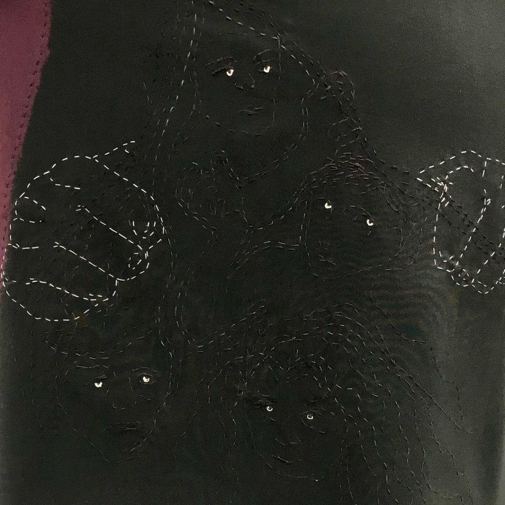 Lydia’s garment became a dark story based on a Dicken’s novel. As soon as she saw this dress, and the long dark swathe of blackness that falls from the hair surrounding the printed woman’s face, she thought of the second spirit that appears to Scrooge in A Christmas Carol, and the cloak they wear. The top two stitched faces have eyes that belong to Ignorance and Want, the allegorical characters from the story. In addition to Ignorance and Want, she added another couple of other characters below. These are Capitalism and Greed – perfect for the Victoria Beckham dress.