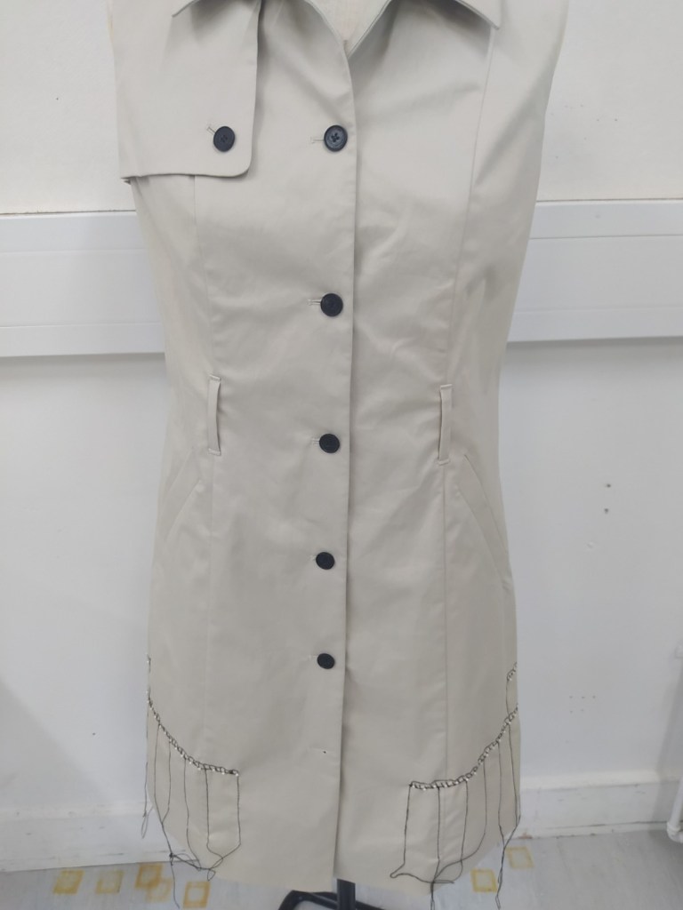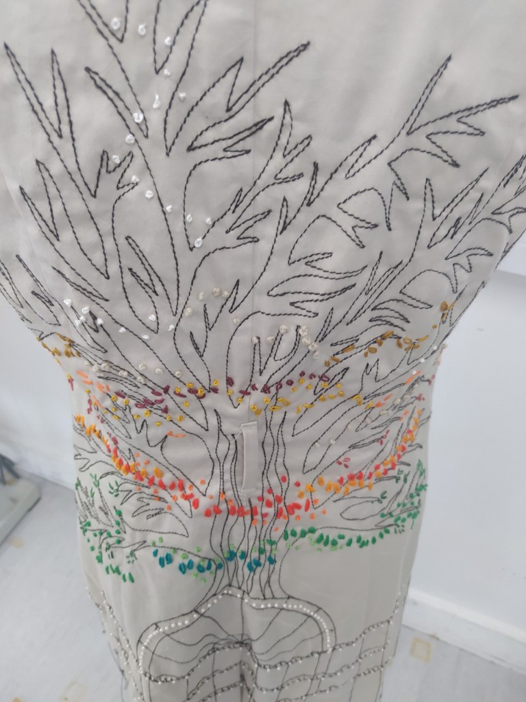 I was allocated an Aquascutum sleeveless trench coat. It was beautifully made and fitted like a glove. My initial research revealed the story of the company, founded in 1851, the year of the Great Exhibition at Crystal Palace, based on the development of a new water resistant fabric and a coat that was worn in the trenches – hence ‘trench coat’, worn in both World Wars and by suffragettes, and later adopted by politicians and stars. In more recent years the brand has lost favour and has become a name in a holding company in the Far East. Armed with this information, I interpreted the Crystal Palace on the back of the coat in stitch and beading, and from it, emerged a tree of life and death, representing the growth and blossoming of the company to its current state of dormancy.