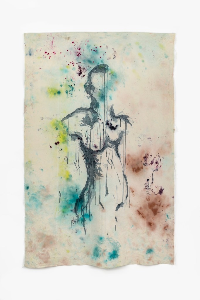 For the first year, the drawings were made on paper with a variety of mark making methods, however, I was curious about how fabric could be included in the process. I was intrinsically drawn to fabric; I had stitched as a child, influenced by my mum, who made many of our clothes by copying designs that she saw in catalogues. We wrap ourselves in fabric when searching for comfort and warmth or when we need to impress for a significant date. It is akin to skin and the movement of the human form. Fortunately, the RCA has a cornucopia of opportunities. At the start of year two I tried a silk screen, mono-print master-class – the medium was liberating. I knew nothing about the process and so I could make without any rules. It was unpredictable and transformative; it became all consuming. I could continue my line of enquiry. With my eyes closed, I dipped one hand in the pot of dye and traced my inner thoughts onto the silk-screen. The lines were uncertain, the marks often messy. They could be layered, as are the complexities of thoughts and experiences, each one affecting the next, as it does in life. I would have one attempt to print the drawing onto the fabric. Sometimes it would go wrong, but at other times I would be left with ethereal marks that spoke about the fragility of being human. I could layer the mono-prints, alter the scale and placement, work on pristine white fabrics or heavily stained, reclaimed backing cloths. The possibilities were endless.