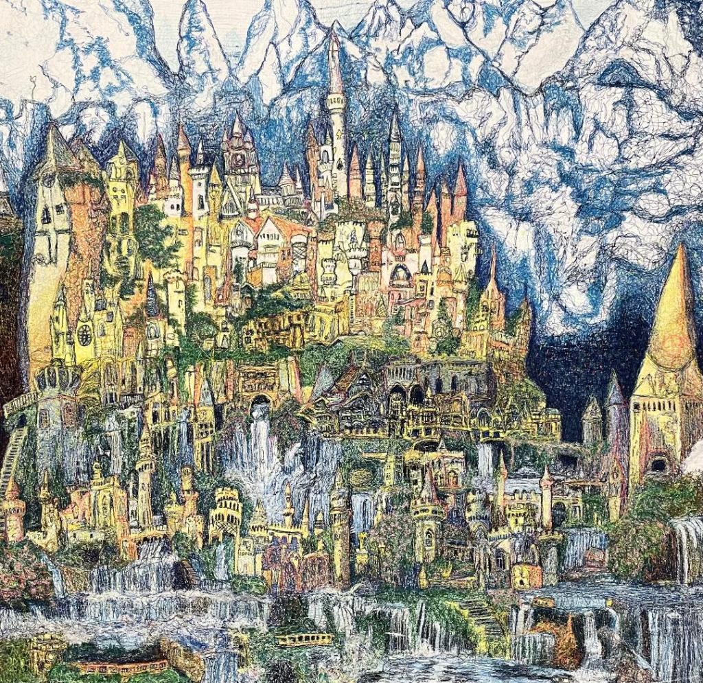 Sewing freehand allowed me to build layers of thread on fabric, introducing challenges like stretch and warping. Aligning uneven layers required small adjustments throughout the process to maintain consistent fabric stretch. Citadel is more than a creation; it’s a passion project that weaves together threads of escapism.
