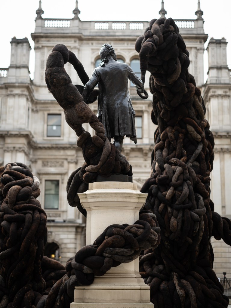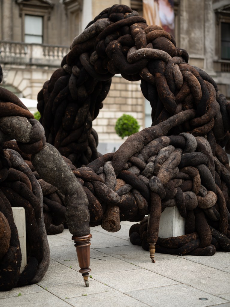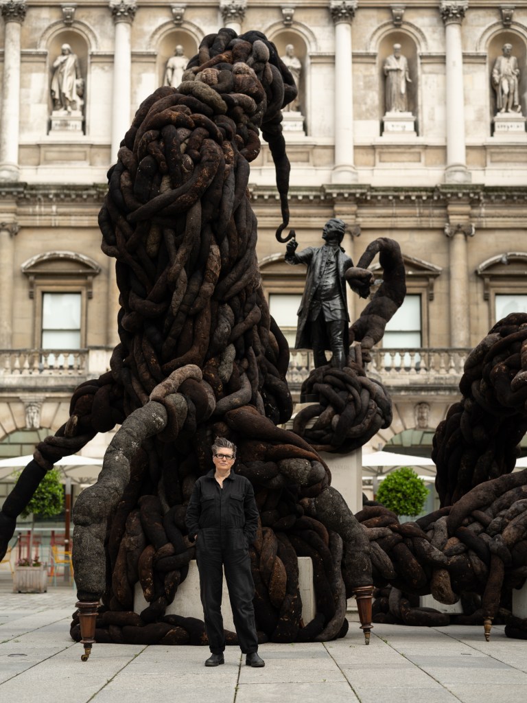 In my sculpture, titled The Meddling Fiend, I explore the blurred boundaries between life and death. In this state of confusion and unsettlement an affirmation of life’s forces arises. I drew on these two paintings to create a site responsive installation that created a new space between it and the sculpture of Reynolds. The installation occupies the Annenberg Courtyard for the duration of the Summer Exhibition (18th June – 18th August 2024).