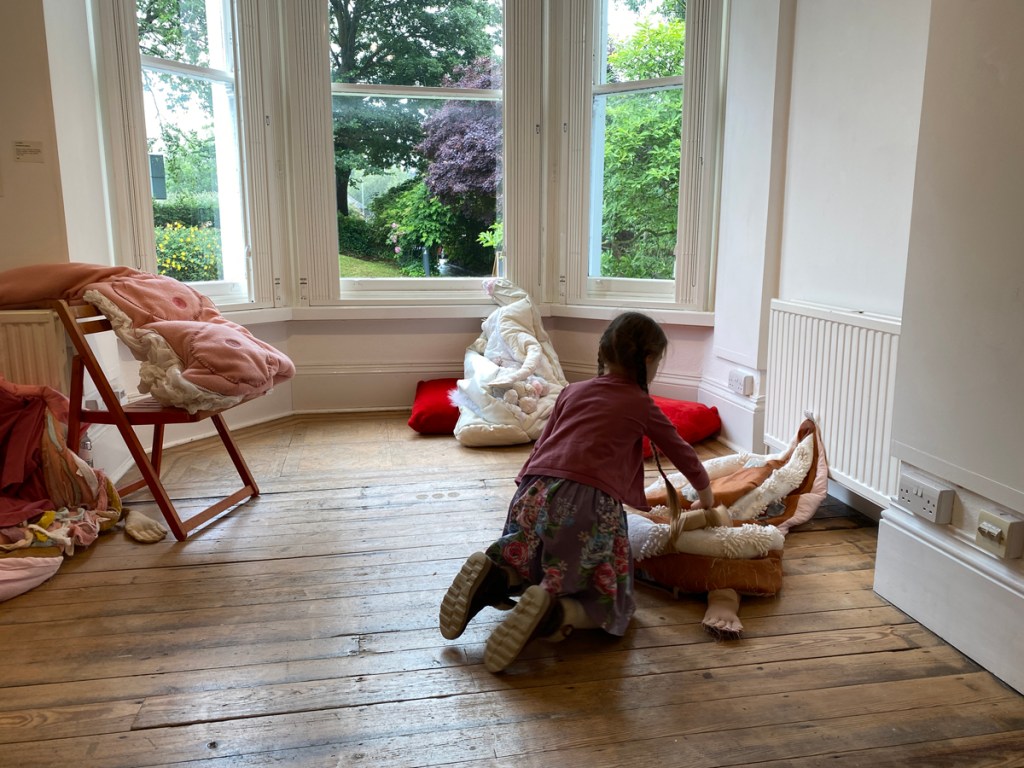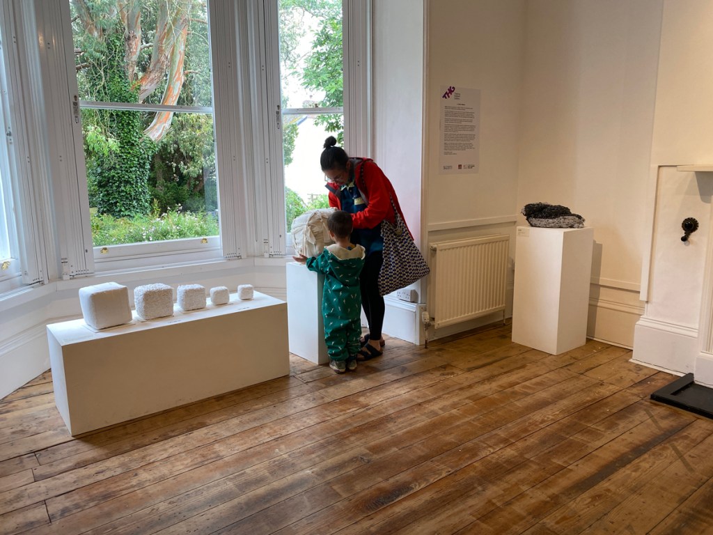 Maybe quite controversially, you’re offered the opportunity to touch some of the artworks. How does it feel to lift up Lydia’s thought provoking, weighty stitched cubes or to cuddle my quirky, body-like pink sculptures? You’re also invited to make your mark by stitching into a naturally dyed cloth book, which has been made by the seam artists. There’s a sampler book which you can handle too. Each page has been made by a different artist. I wonder if you can work out who made which page? You can also do some weaving of your own in one of the rooms upstairs, with all materials and tools provided, thanks to the gallery staff. It’s the perfect mellow activity for all ages.