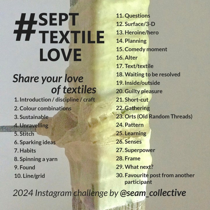 How it works: there is a prompt for every day in September and you can respond to as many, or as few, as you like on Instagram. To help you get organised you can download our pdf planner. In your caption use the exact hashtags #SeptTextileLove and #SeptTextileLove24, and tag @seam_collective, so that we and all the other participants can find your posts to like and comment. (It’s also helpful if you include the prompt you are responding to, as sometimes different time zones can make it difficult to tell which post is for which day or prompt.)