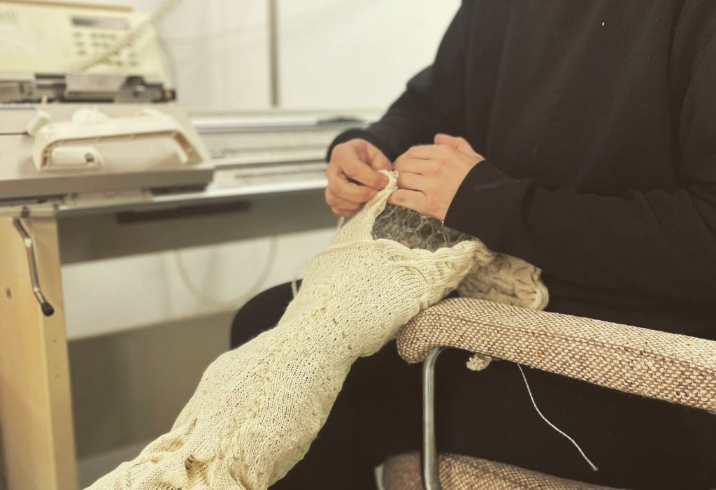 Rather than discard these remnants, I chose to remake. In UnEarthly Jacket, I returned to World 74—a speculative future I had proposed in 2021 for Amy Twigger Holroyd’s Fashion Fictions (Holroyd 2025). In World 74, clothing is made from textiles used initially for food production – in a way cultivated rather than produced. In that world, garments are not fixed but mutable, grown and regrown. Inspired by the geographical variance of knitting patterns around Europe and beyond; in World 74 the texture on an item of clothing, could tell you about the food culture of region of the person that made it – for example a certain texture selected to be favourable for growing peas. UnEarthly Jacket was my play within that world—something lived, remade, worn.