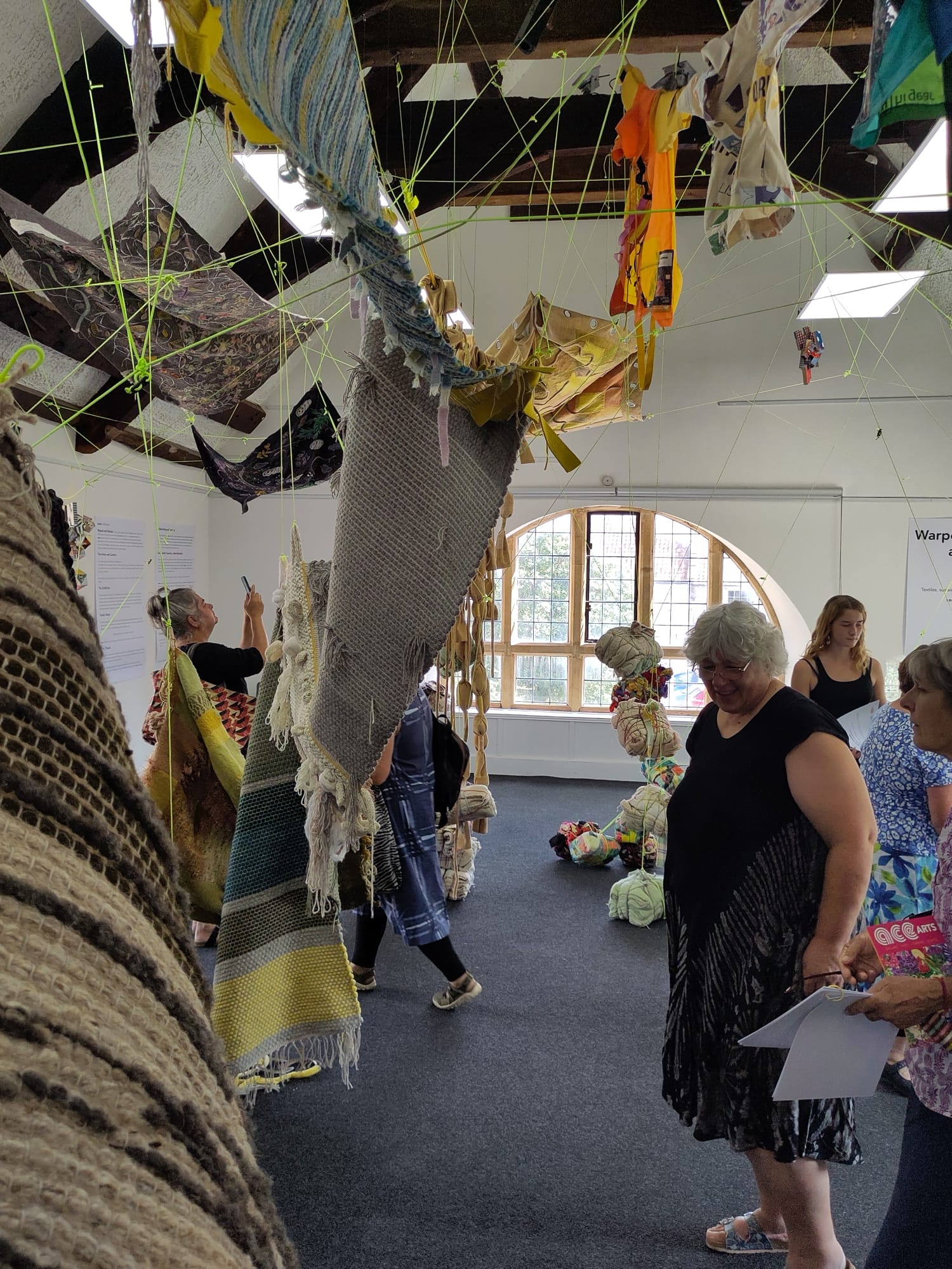 Preplanning was essential as we worked through many iterations of how it could work. Nicola mocked up a visualisation and creating the framework of suspended guy ropes across the whole gallery and then introducing some of the pieces approximately around the room was the starting point. Hanging the rugs was a spontaneous decision and a commitment to the process. It became more difficult to navigate with the ladders as more work was hung so decision making was and had to be, decisive.’