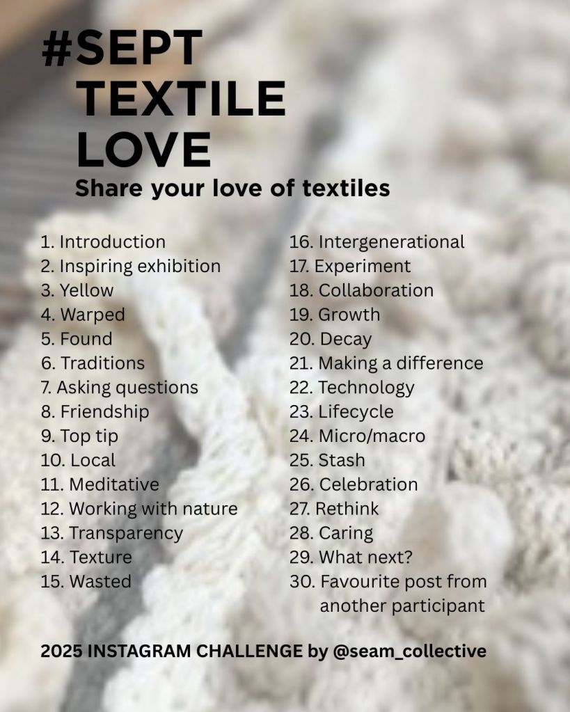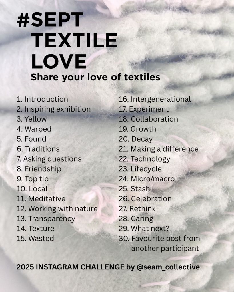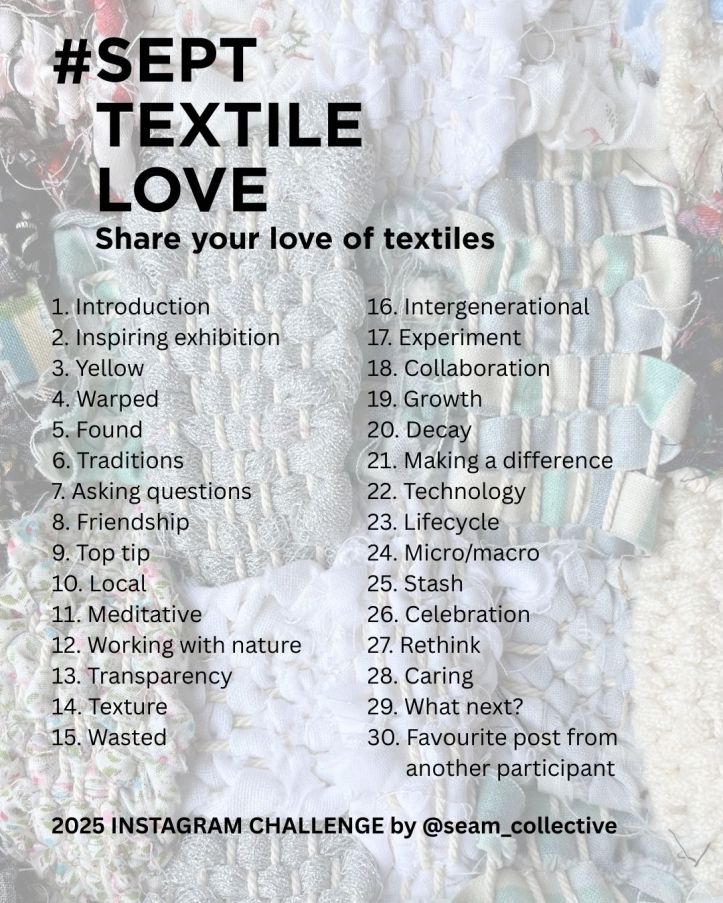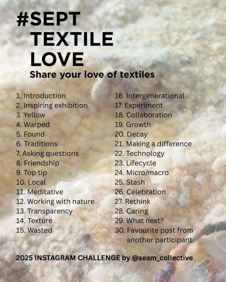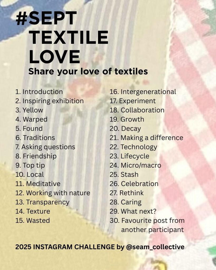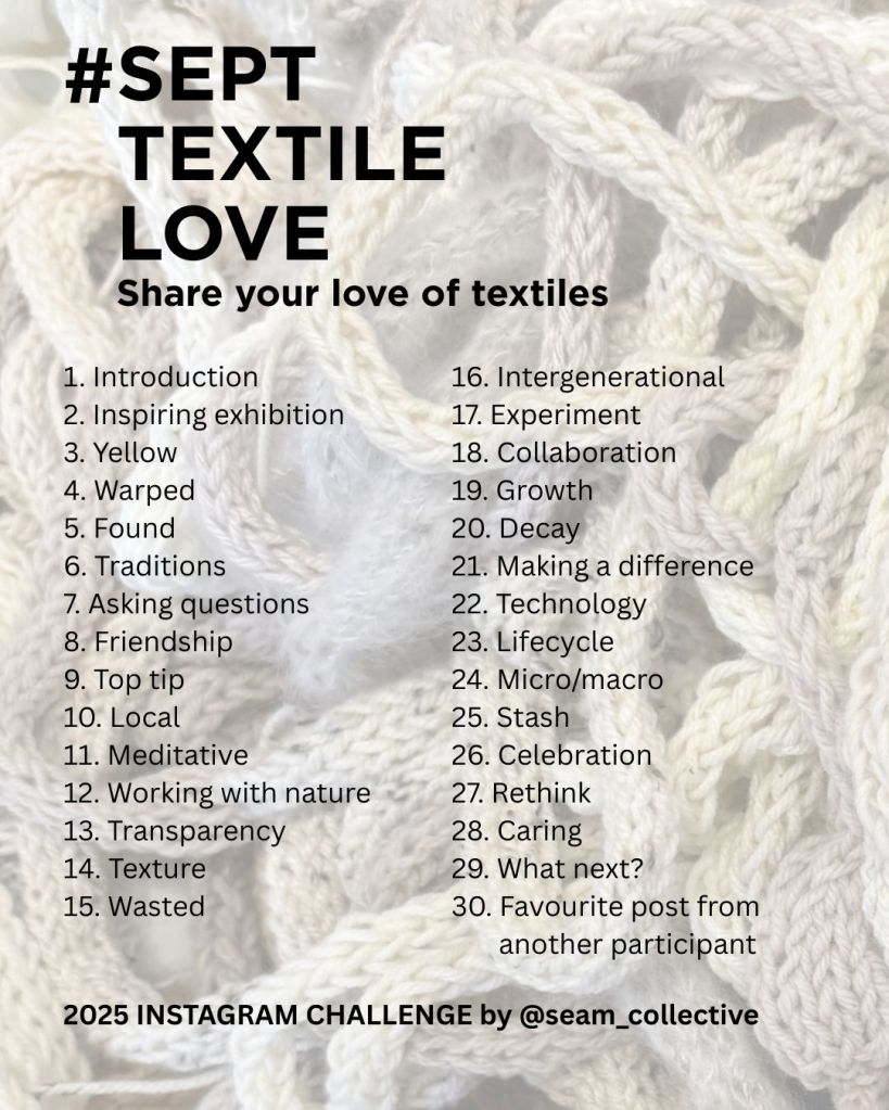 In your caption please use the exact hashtags #SeptTextileLove and #SeptTextileLove25, tag @seam_collective, and use the new daily hashtag too: #STL25Day1, #STL25Day2 etc. so that we and all the other participants can find your post to like and comment. For example ‘Yellow’ is the prompt for Day 3 so it should have the hashtag #STL25Day3, so it will be easy for you to find everyone’s joyful yellow responses!
