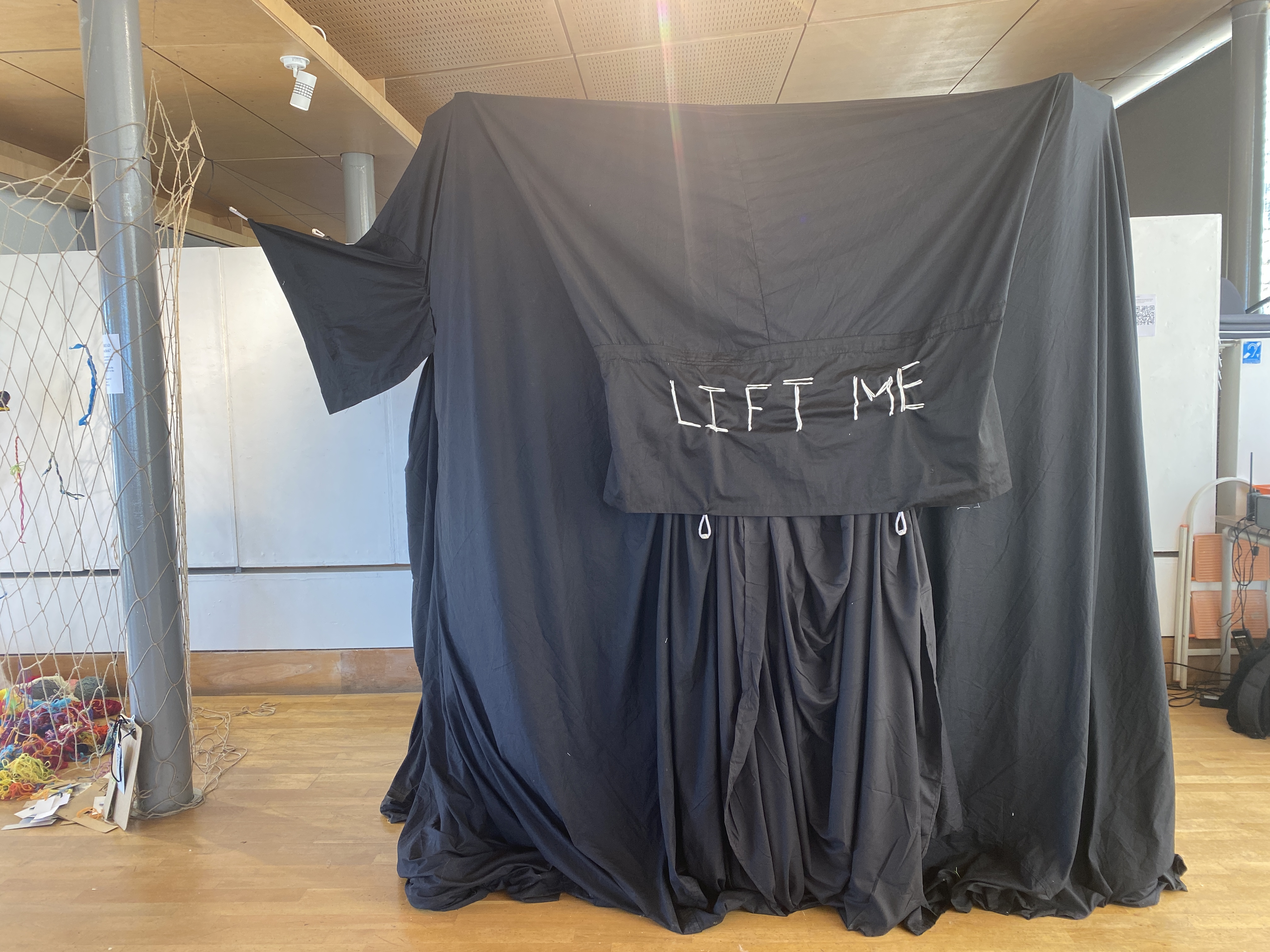 Visitors were also invited to add something to a feedback installation – strips of recycled cloth and yarn or a label made with recycled cardboard. It was wonderful to see how the space was transformed over the course of the exhibition! This participatory installation was initiated by Lou Baker, facilitated by seam collective and transformed by visitors to the exhibition; you can read all the responses here. Many thanks to everyone involved!