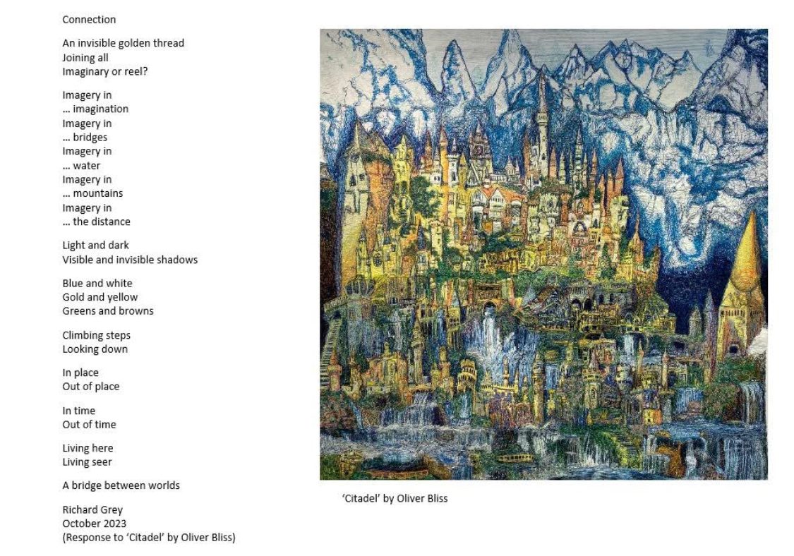 We were delighted that a local group of poets, ‘Words at the Black Swan’, who meet regularly at Black Swan Arts to respond to the exhibitions there, wrote several poems about some of the art works in our exhibition. Many thanks to all the poets!