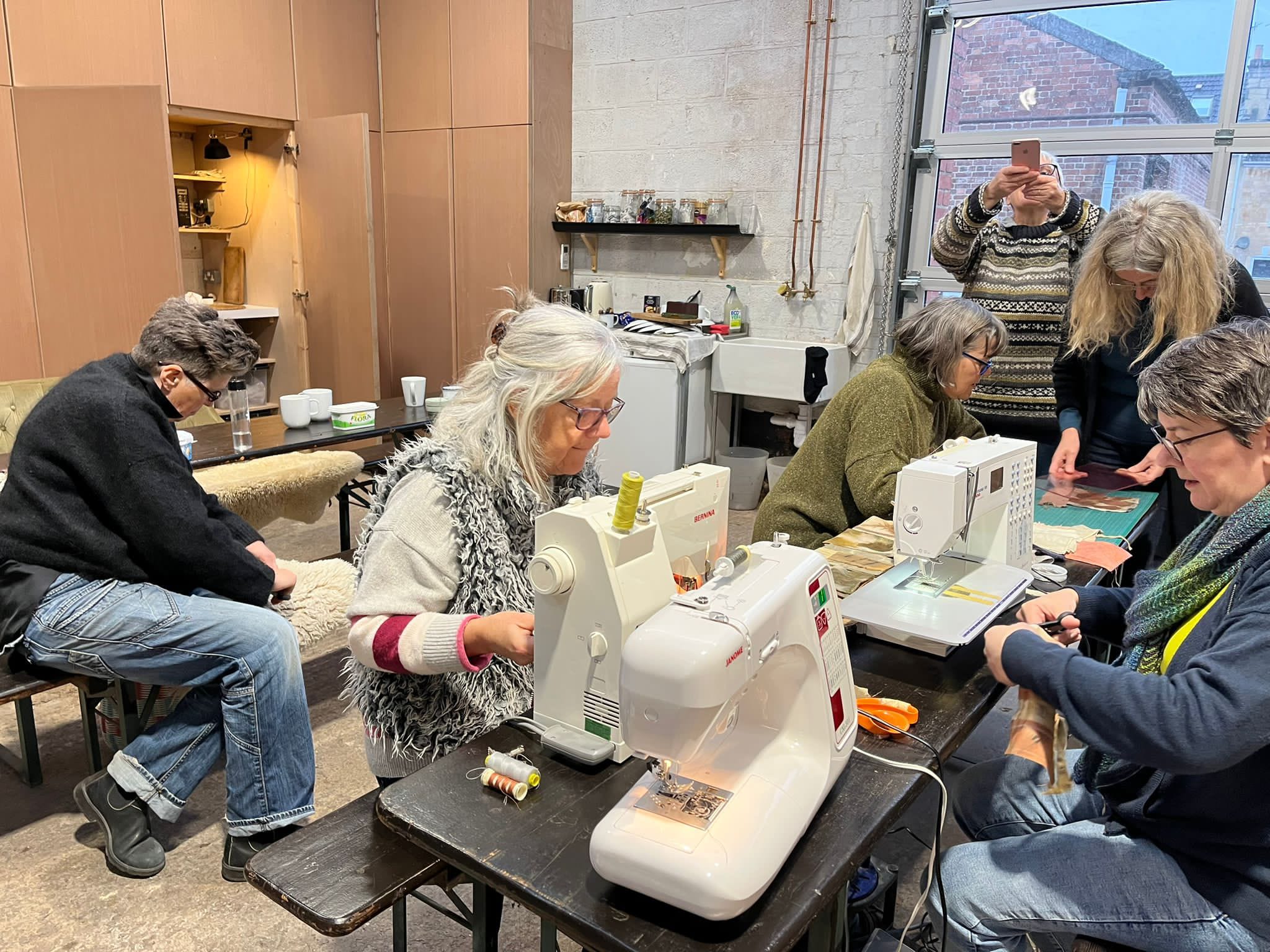 Day 2 was a collaborative day of stitching the dyed cloth into pages which then can be cleverly attached to make a looseleaf book. The seam members involved today were again led ably by Helen MacRitchie and included Lydia Needle as well as some of the dyers – Penny Wheeler, Joy Merron, Jane Colquhoun and Nicola Turner. Thanks to Nicola for letting the group use the fabulous space in FormICA studio in Bath.