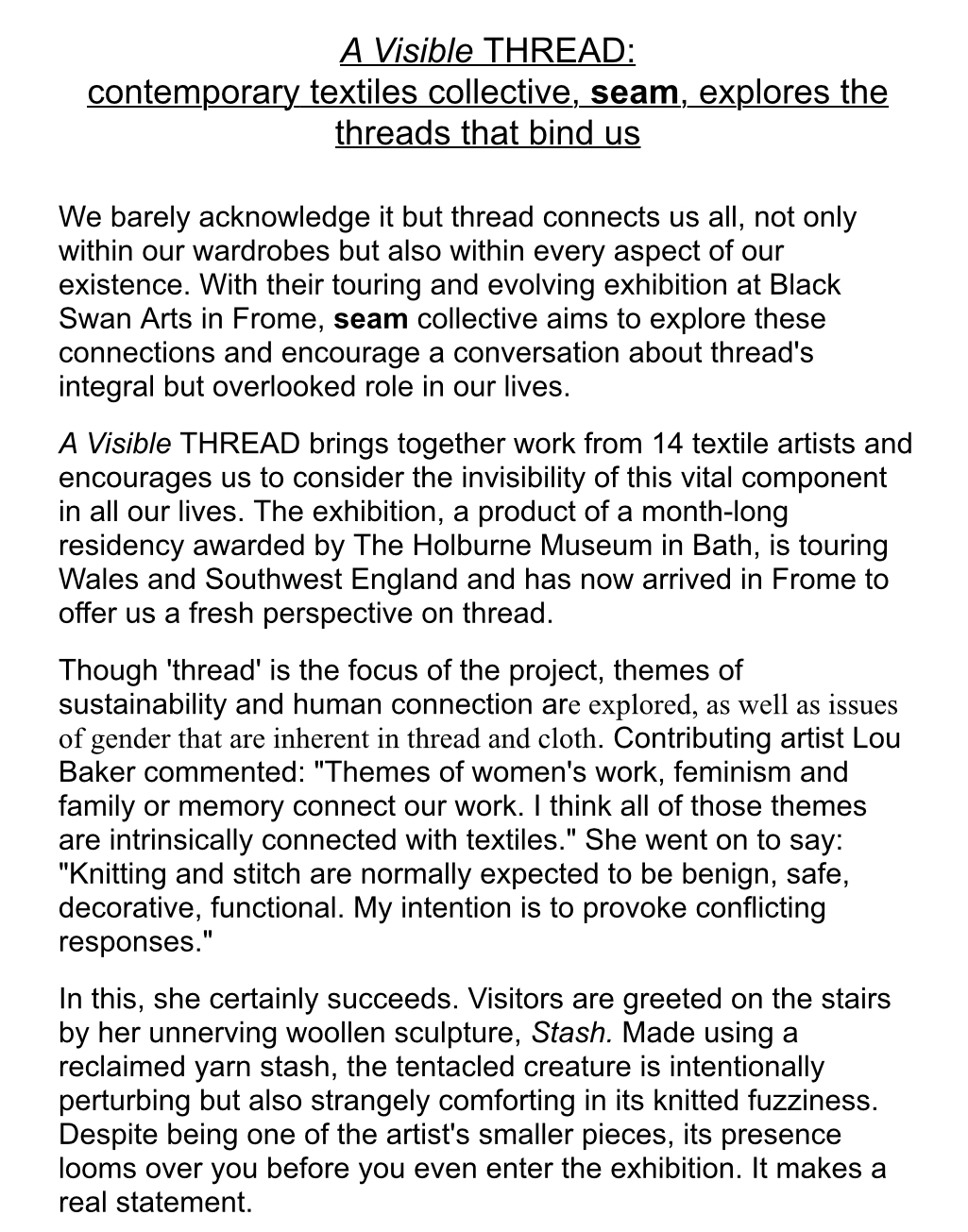 October 2023: Many thanks to Helen Stay, a local writer in Frome, who wrote this review of A Visible THREAD at Black Swan Arts.