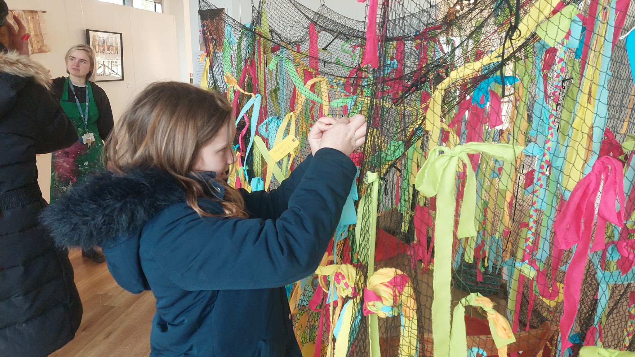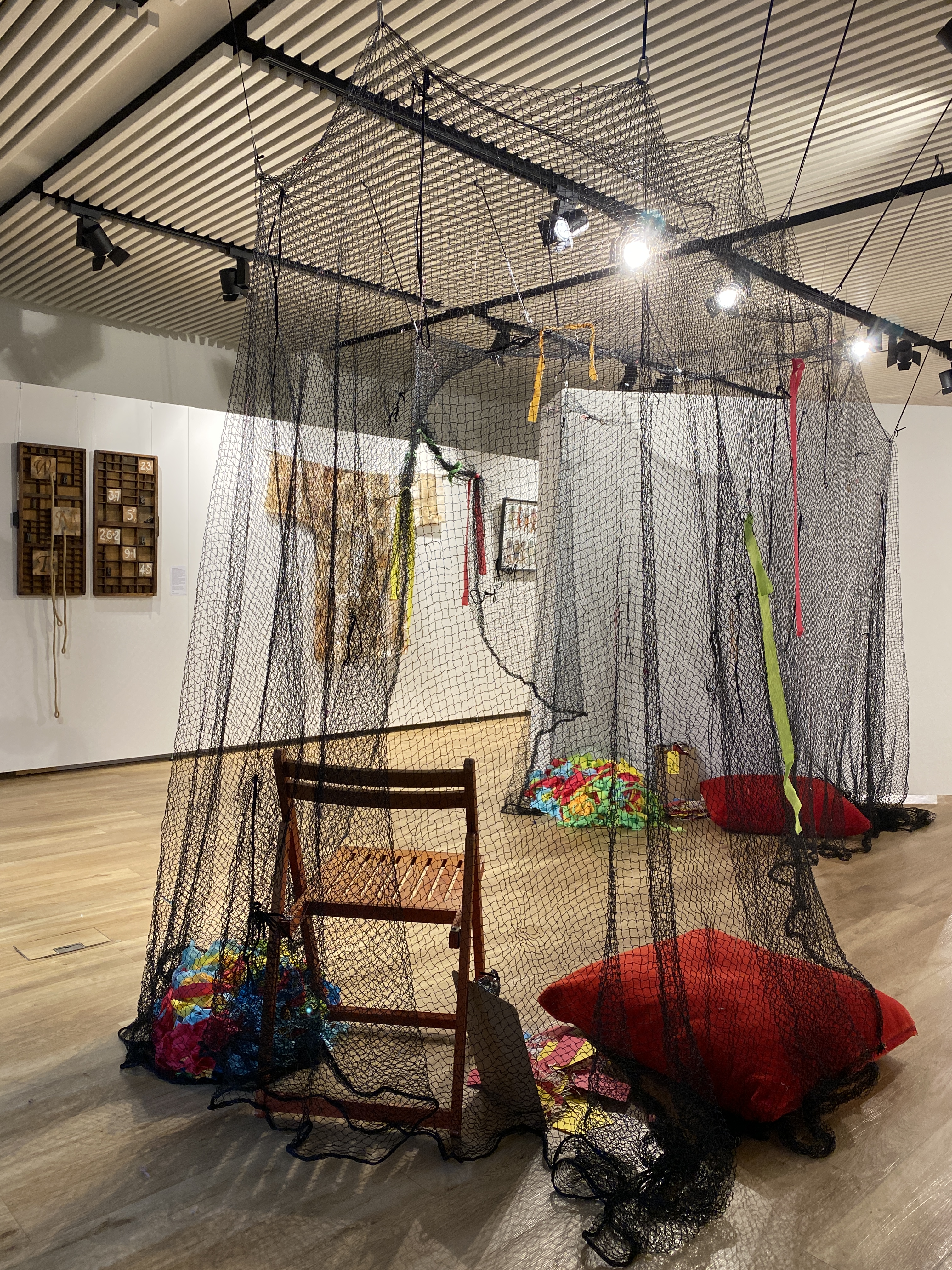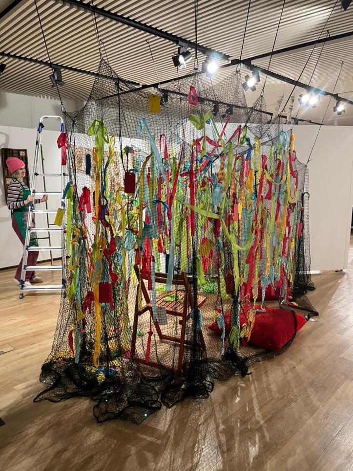 Lou Baker installed a participatory, walk-in installation, Safety Net. Visitors were invited to think about what made them feel safe, write it on a label and add it to the netting. There were also strips of bright cloth which could be added too. It was thrilling to see how the space was transformed during the course of the exhibition.