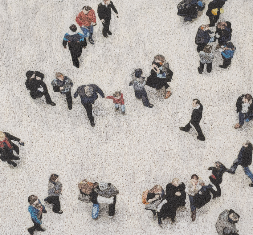 Jane Colquhoun is an embroiderer and mixed media artist. Much of her inspiration currently comes from the patterns made by configurations of figures in the environment. The resulting small, detailed embroideries are worked with free motion machine embroidery onto canvas. Like most people nowadays, images of everyday life might be framed through the lens of a mobile phone, that snapshot moment of inspiration collected, and stored with little consideration. Jane recognises this impulse to collect and gather as a thread that runs through much of her creative life, and forms the basis for her embroideries and mixed media work. Sometimes a scrap of fabric or found object will inform the direction of a piece, just like a phone snap or screenshot inspires the embroideries.