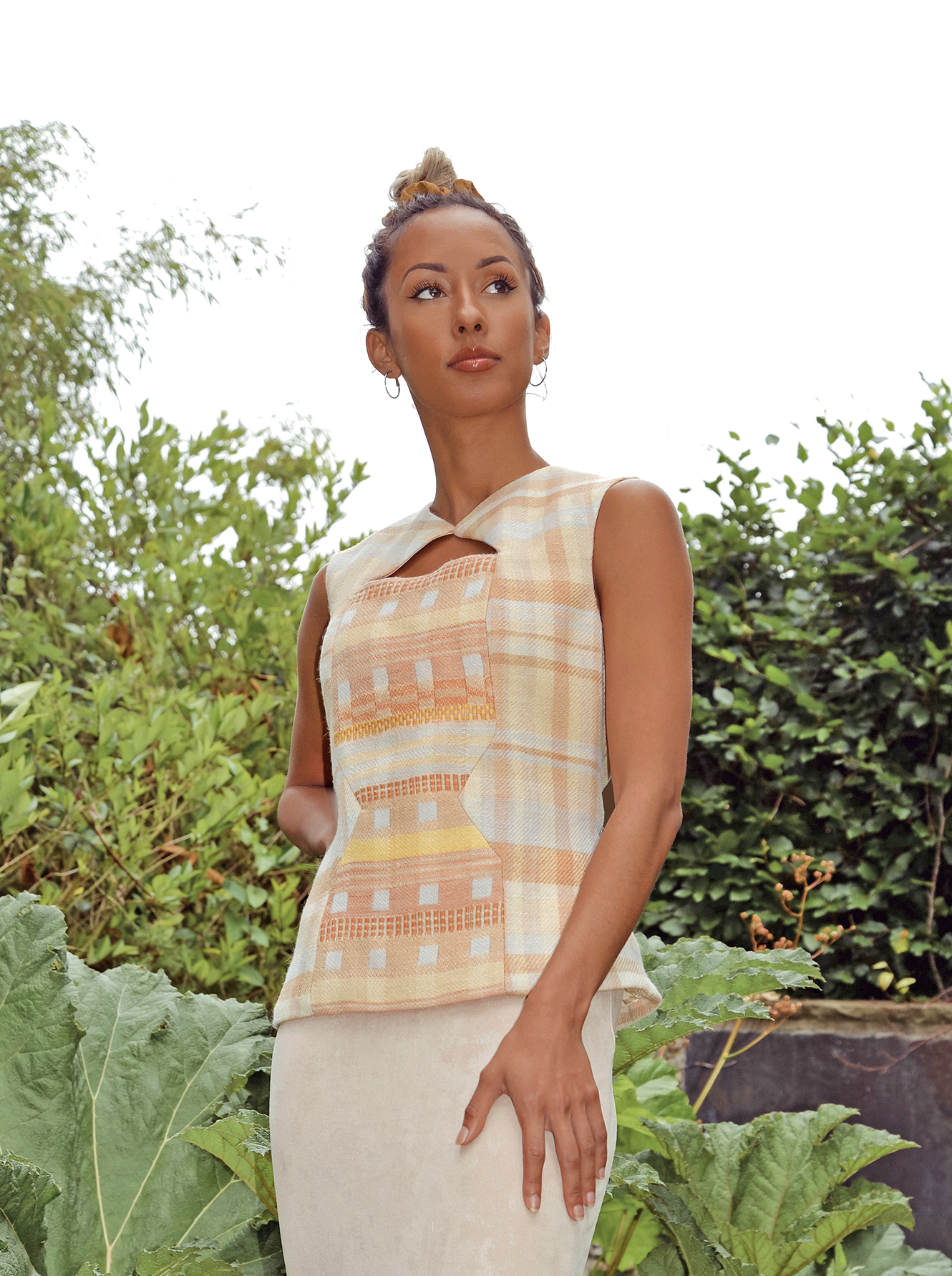 Linda has not used oil derived products in her garments since 1997, choosing to replace synthetic interlinings with recycled off cuts and replacing zips with bio-degradeable buttons.