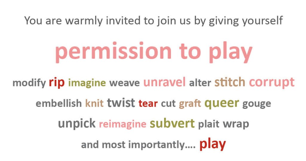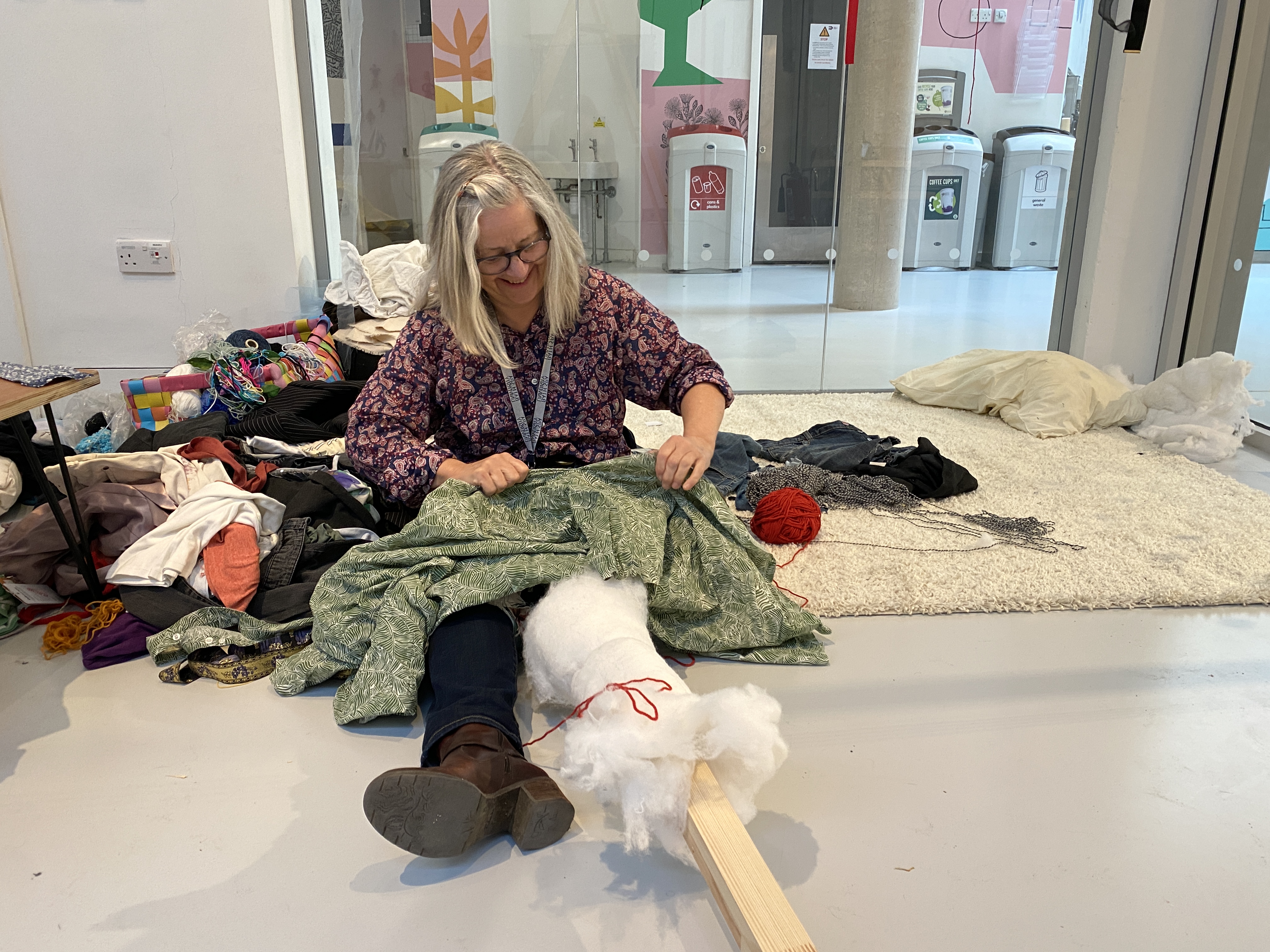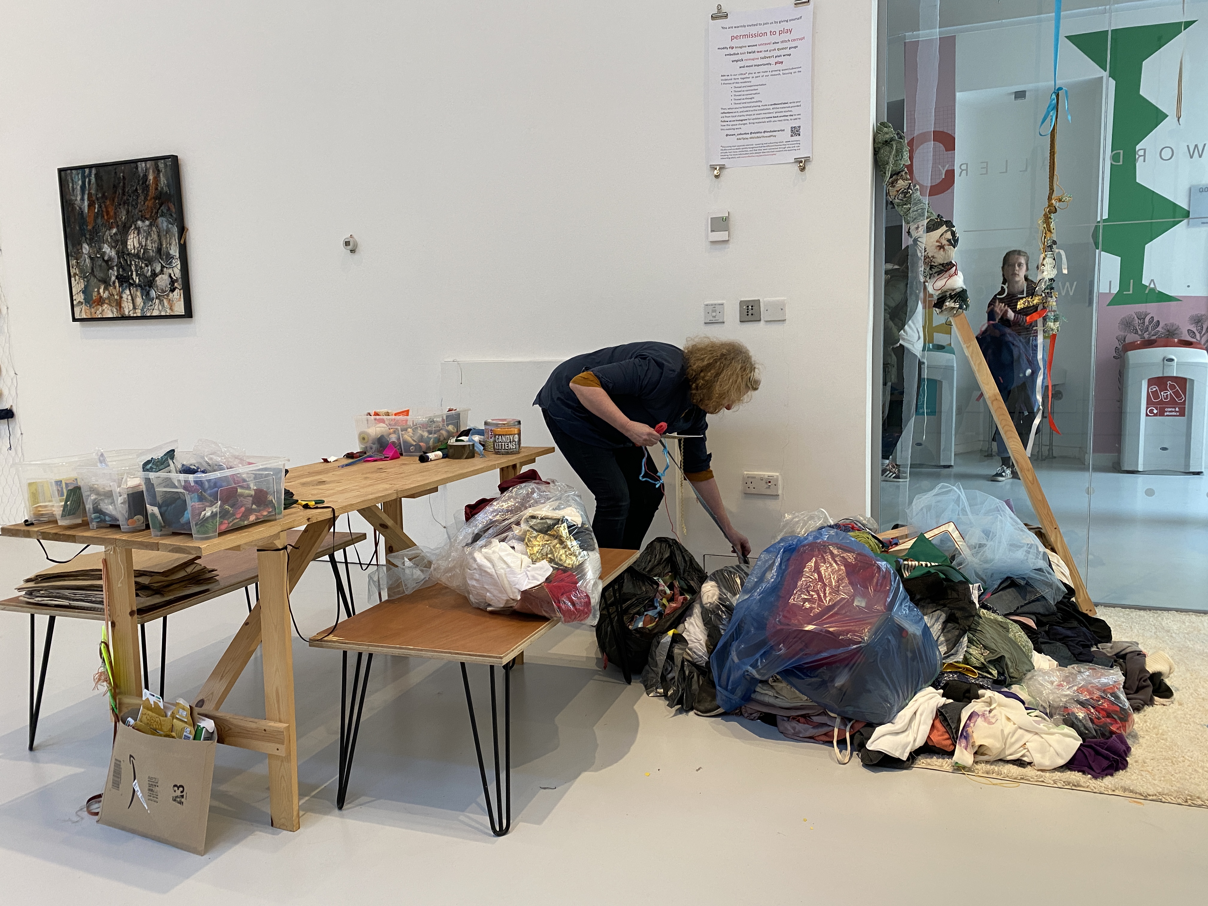 We encourage you to use sustainable materials and explore ‘play’ in your own terms. All the materials provided in the gallery are damaged stock from local charity shops or seam members’ private stashes. You are invited to also bring or use materials from your own home, things you feel are representative of yourself, that you are happy to let go of and alter to contribute to the evolving sculpture in the gallery or to your own work.