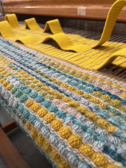 I simplified my process to use only plain weave and combined multiple strands of yarn to create an extra thick weft. Up to 16 or 20 strands at a time. This was a great way to weave large lengths efficiently and use up lots of my yarn stash to create a functional floorcovering.