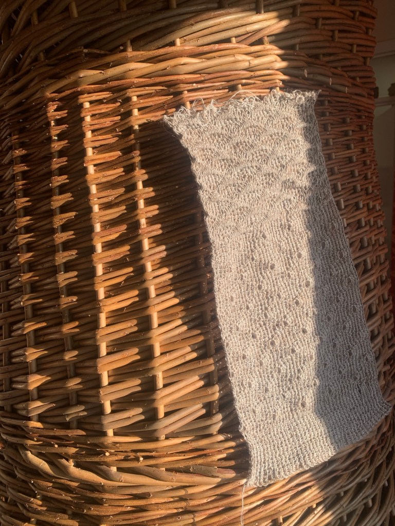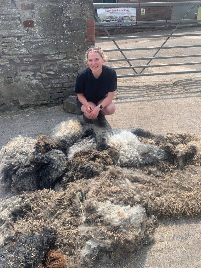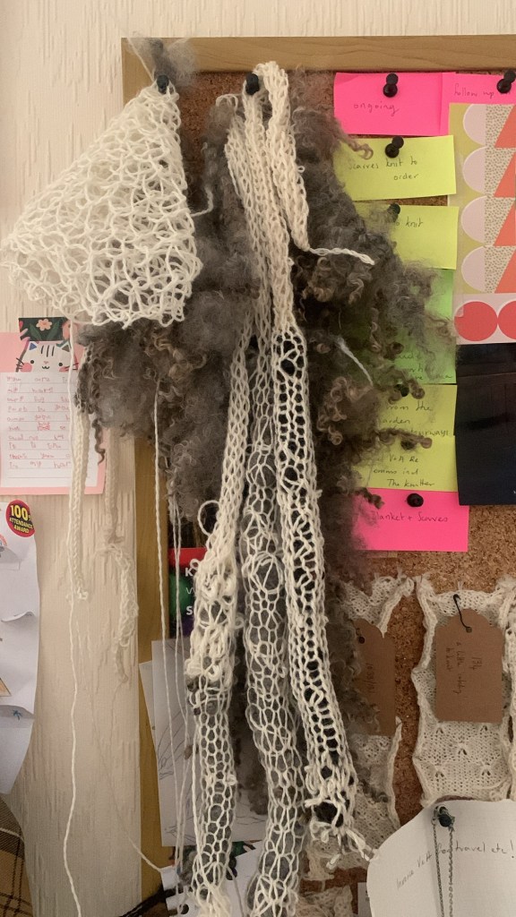 ‘Developed from waste materials gathered relationally – in phase with the subtle flows of my environment – this piece is formed from Somerset willow offcuts and skinned in knitted Alpaca found on the side of the road in Bristol, and then dressed in raw sheep fleece sourced from Elm Tree farm in Bristol. Speaking to the material heritage of Somerton, I sourced these materials, poised at the edge of discard, to ravel into presence: a sculptural volume enlisting the skill of basket maker, Lewis Prosser. Inspired by concepts of energy cycling from permaculture, in making this work I concerned myself with making at the cusp of wastage for these materials – and asking myself at what point is a material no longer good enough to be used for something else? And how can we intervene in this material cycle? How can these states of waste be transcended and waste rendered material for another process?’