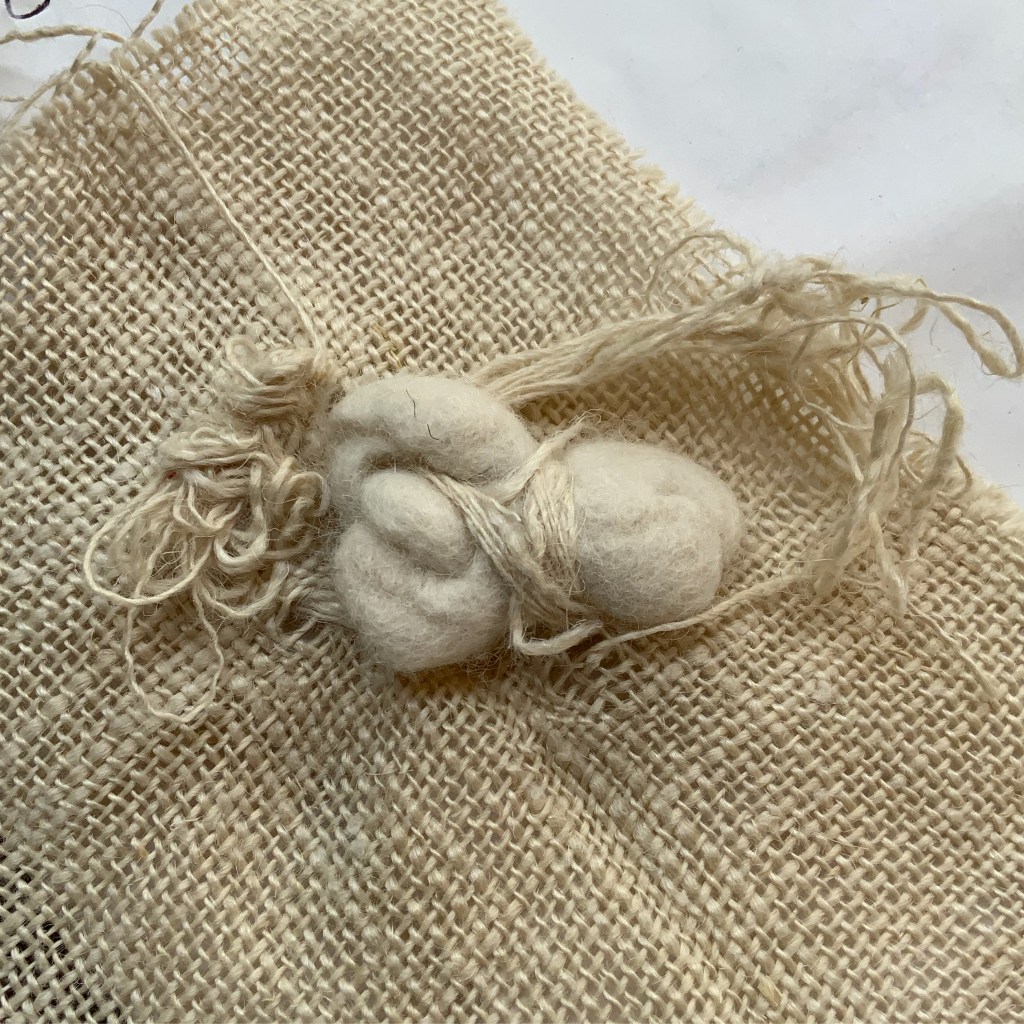 Materials: Motheaten vintage blankets, wool yarn, string, wool tops
