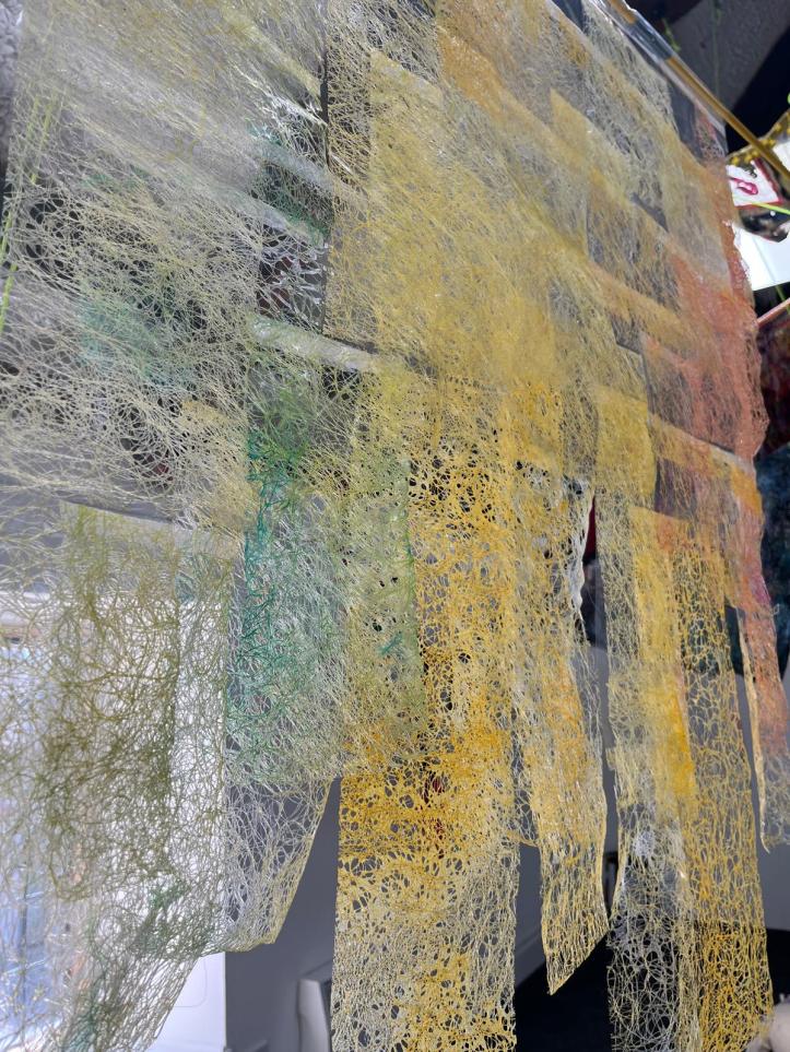 ‘This work explores the environmental and social impacts of consumer habits, particularly in fashion and textiles. Using packaging waste from shipped goods as its primary material, it reveals the hidden costs of products manufactured across various countries. By combining delicate transparent fibres with discarded plastics, the piece highlights overconsumption, material waste, and the fragility of global supply chains. The installation, made entirely from waste, encourages viewers to reflect on their role in sustainability and product lifecycles. Through transparent and opaque forms, it examines visible and hidden challenges, stressing that sustainable change requires diverse perspectives and collaborative approaches.’